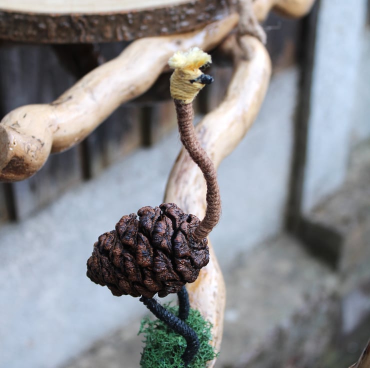 Add a touch of woodland magic to your home with this handcrafted Hanging Plant Basket, made entirely from natural branches and organic materials. This one-of-a-kind Hanging Planter features a floating wooden base and a whimsical decorative bird, crafted from a pinecone, wire, woolen thread, and real moss.