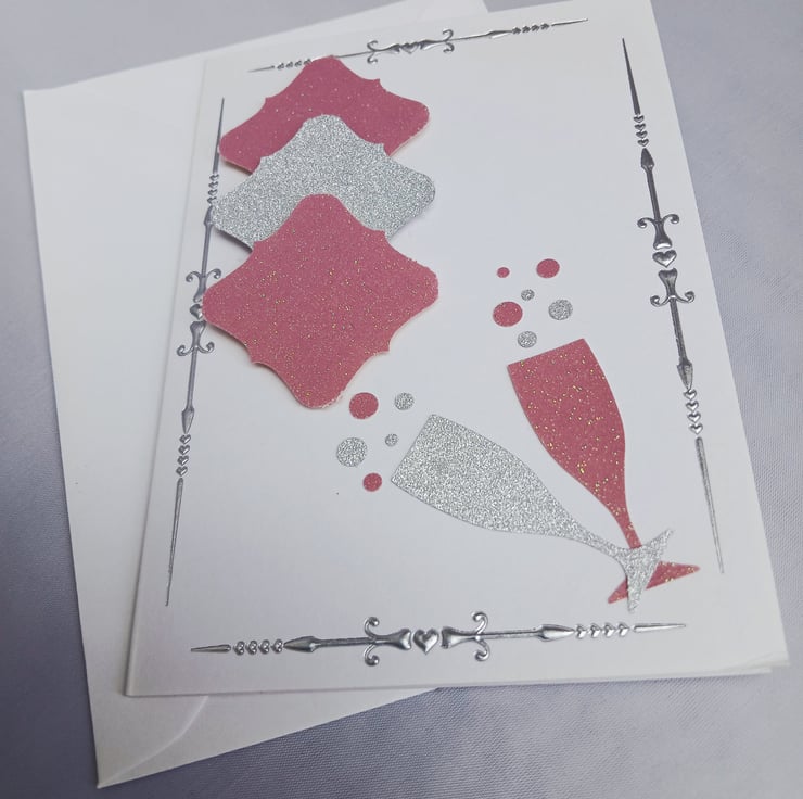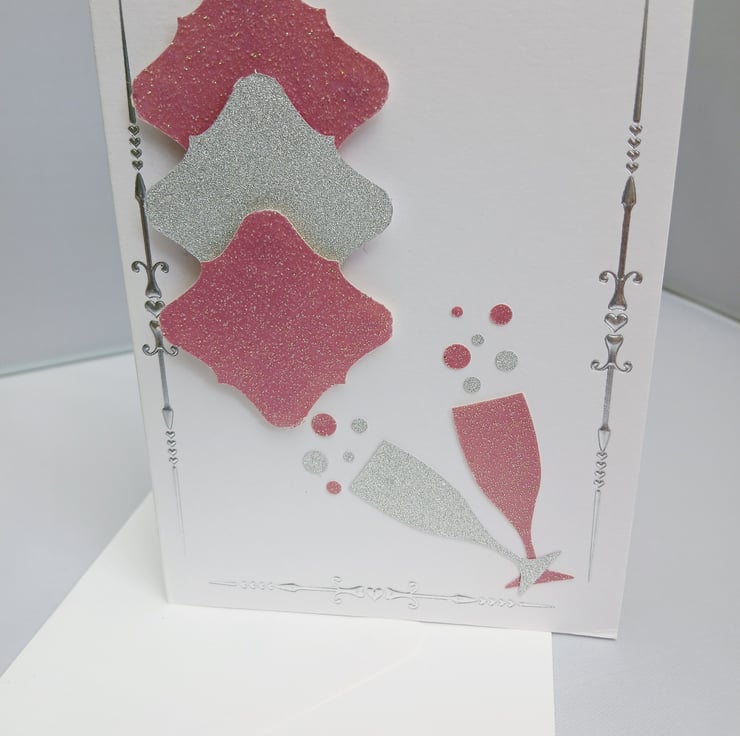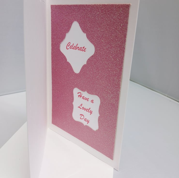 Birthday Card with Glitter Champagne Glasses. This card measures 4" x 6" and comes with an accompanying envelope, and has silver decoration around the edges. Champagne glass cut outs in glitter silver and dusty pink have been added along with silver and dusty pink bubbles. As well as ideal for a birthday card this also would be ideal for an anniversary card., The inside has the matching dusty pink glitter with 2 cutouts with 'Celebrate' and 'Have a lovely day' The card will be sent in a cardboard envelope