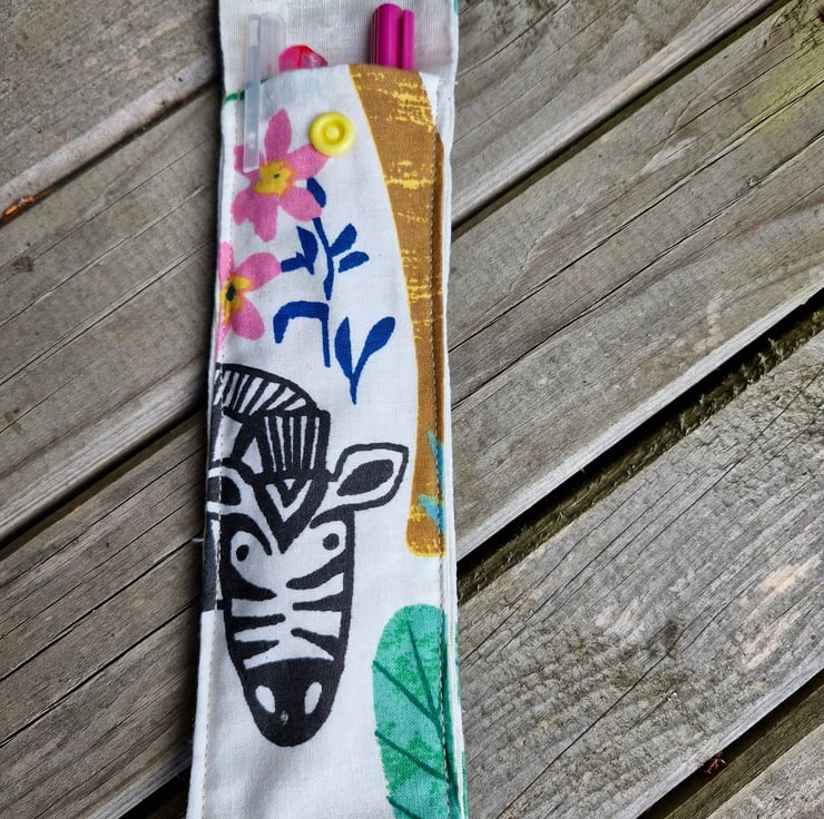 It is made from upcycled polycotton material with a jungle print pattern and is fully lined with a lightweight cotton lining.