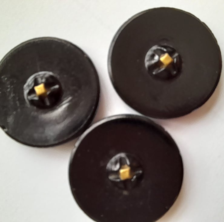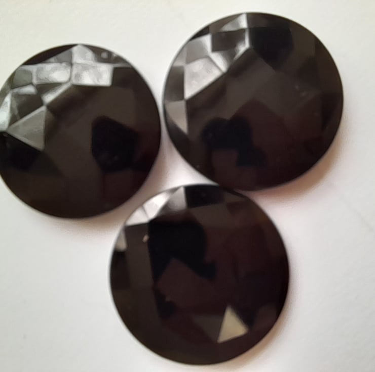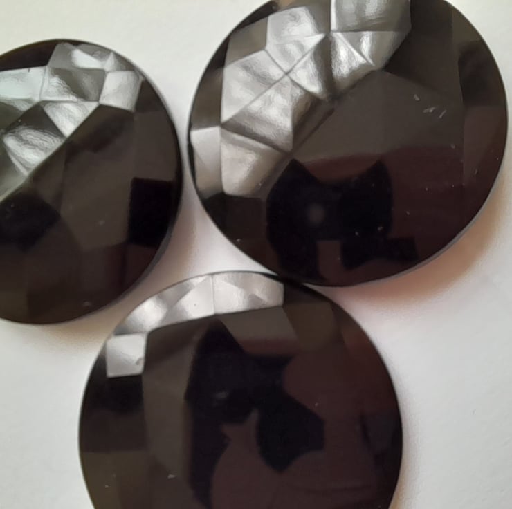 3 large glass vintage buttons, 32mm in diameter, in a beautiful black gloss colour, back shank loop, with a multifaceted surface. These will add a touch of glamour to your projects.