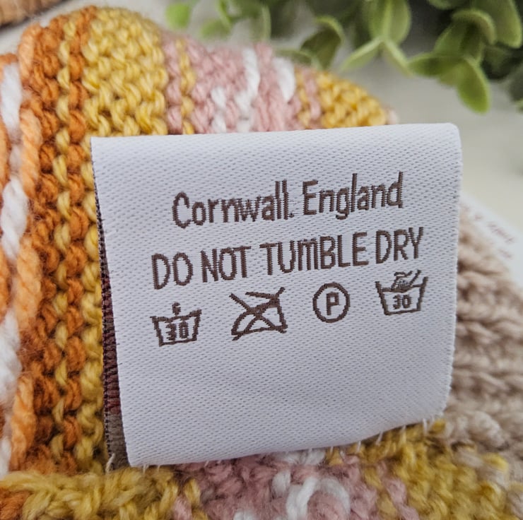 Baby knitwear is designed and hand crafted by Demelza Designs in Cornwall meeting UK baby safety standards, Only branded premuim acylic, acrylic/natural fibre blends or pure natural fibre yarns are used in baby knitwear which conforms to BS984/76 standards.