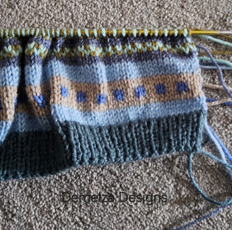 Traditional hand knitted Fairisle designs takes considerable skill as the knitters tension must be even at all times to stop the work from becoming tight or too loose. One photograph shows a hat during it's construction. All colour change yarn ends are blind sewn into the work or used where possible to colour match the seam.