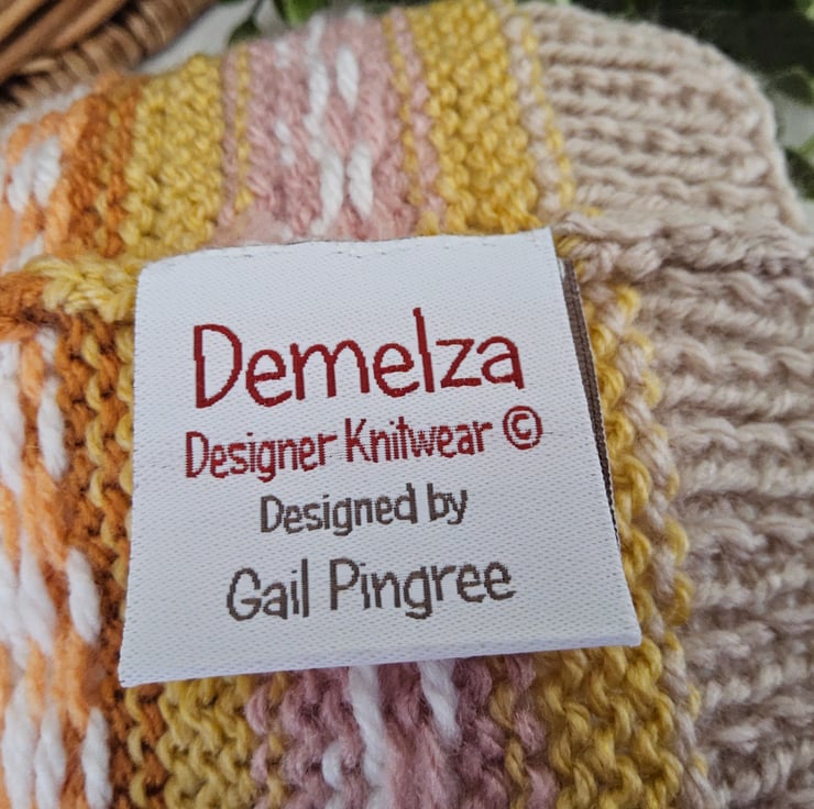 The luxury soft damask garment label has been hand sewn to the inside of the hat seem with the care instructions woven within it for lasting reference. A matching Demelza Designs garment swing tag is attached for a totally professional finish one expects from quality designer garments.