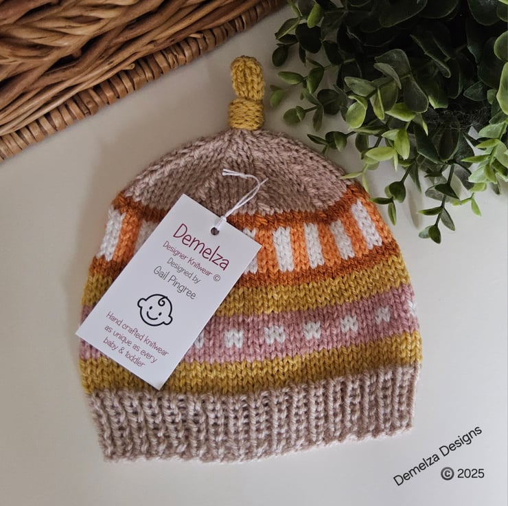 A unique eye catching hand knitted traditional fairisle baby knotted pixie hat been designed and lovingly hand crafted in Cornwall for those seeking total individuality and quality. The yarns used are premium machine washable acrylic. This adorable little hat will make a perfect token gift for any mother and baby to receive.