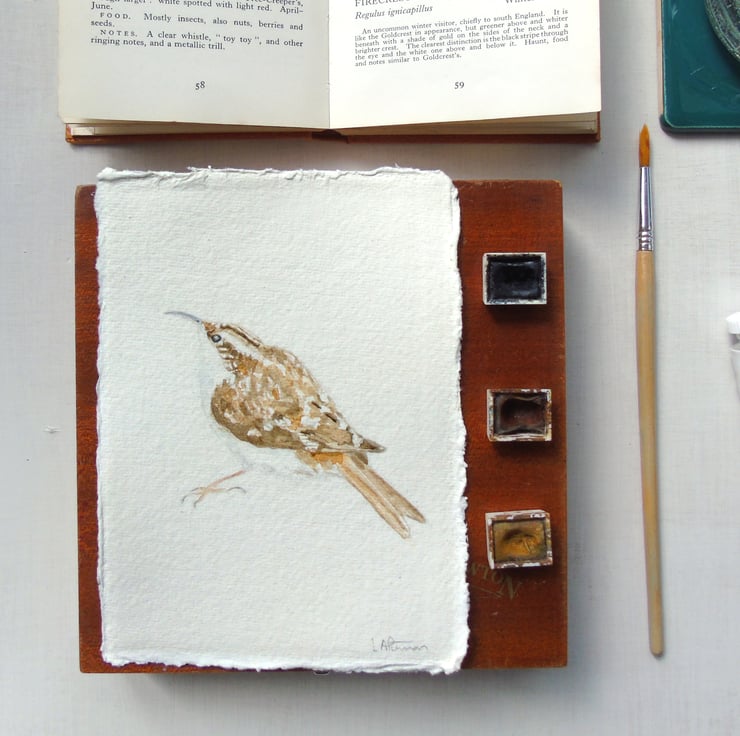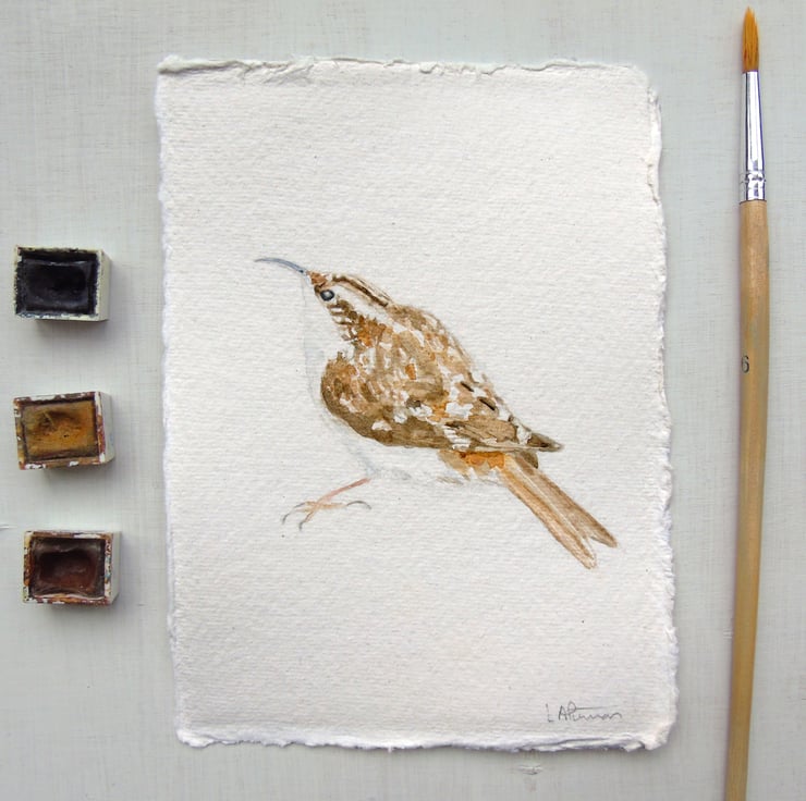 Unframed original watercolour painting of a treecreeper, quite comical birds to observe as they scuttle up one tree trunk to the next. One of a set of four original paintings inspired by visits to a bird hide near Bamburgh in Northumberland.