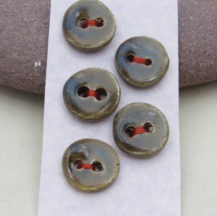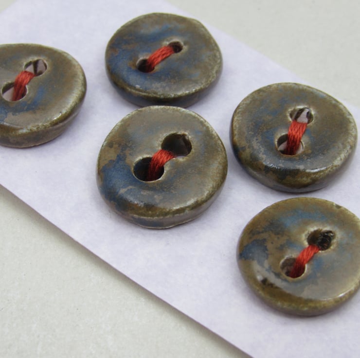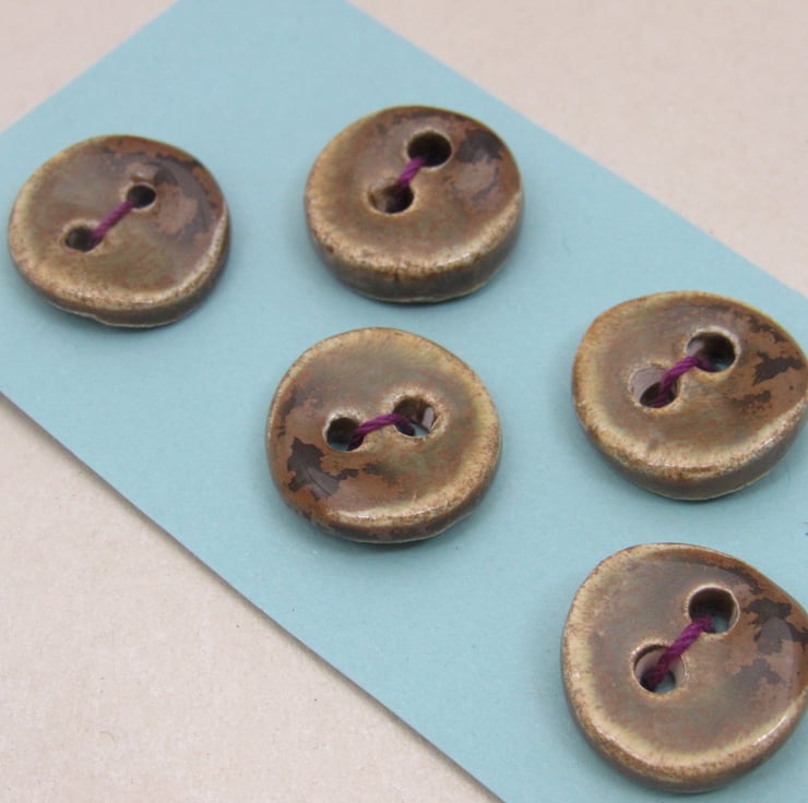 5 small stoneware buttons finished with a mottled khaki brown glaze