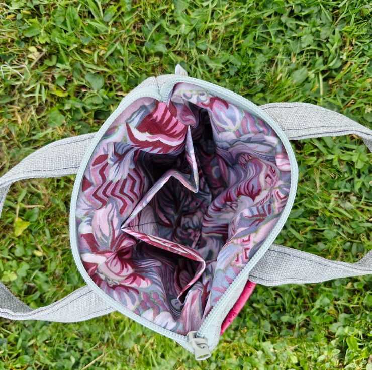 It is fully lined with the same pink, burgundy and blue floral cotton fabric as the pocket and there are 2 additional pockets inside for organising your stuff.