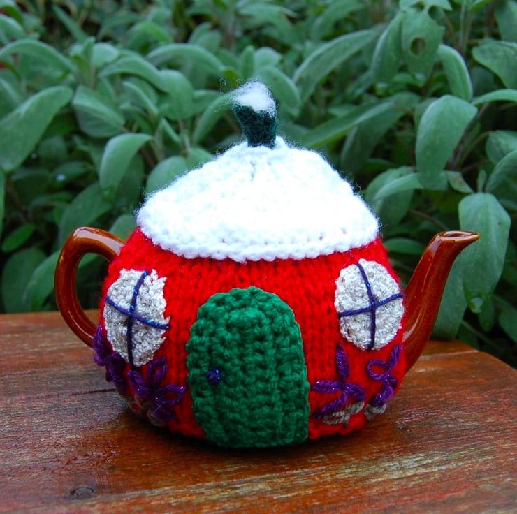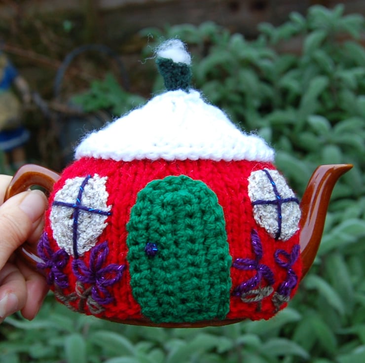 I've been knitting and crocheting tea cosies for many years. This is one of my favourites, there are so many ways to decorate a country cottage.