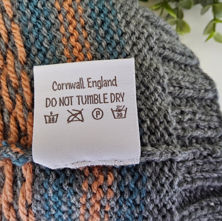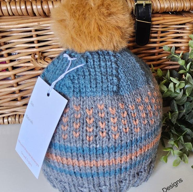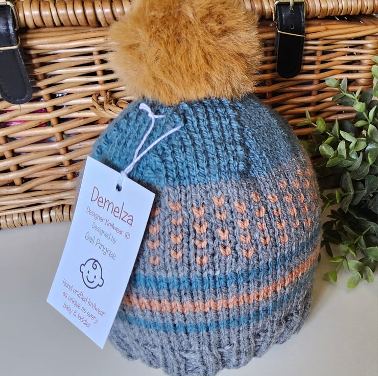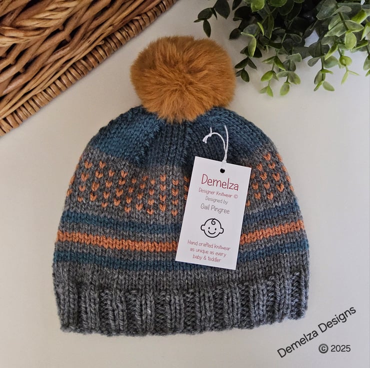 This unique toddler's traditional fairisle pompom hat has been designed and lovingly hand crafted in Cornwall for those seeking individuality and quality. The yarns used are premium machine washable acrylic. The pompom is fluffy and firmly attached.