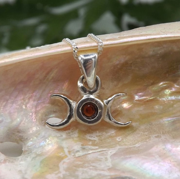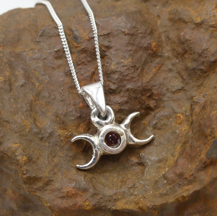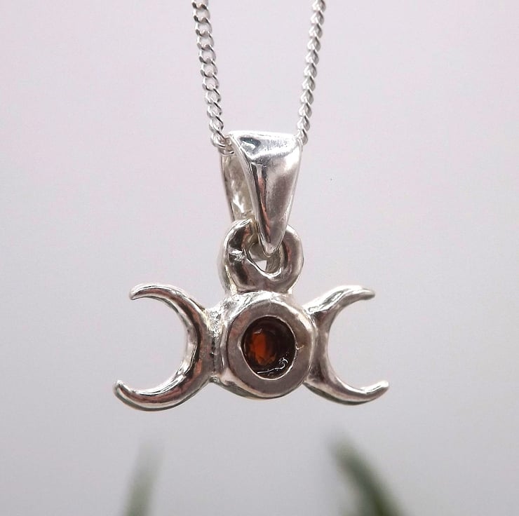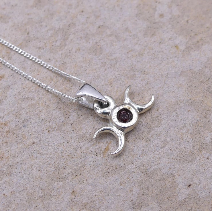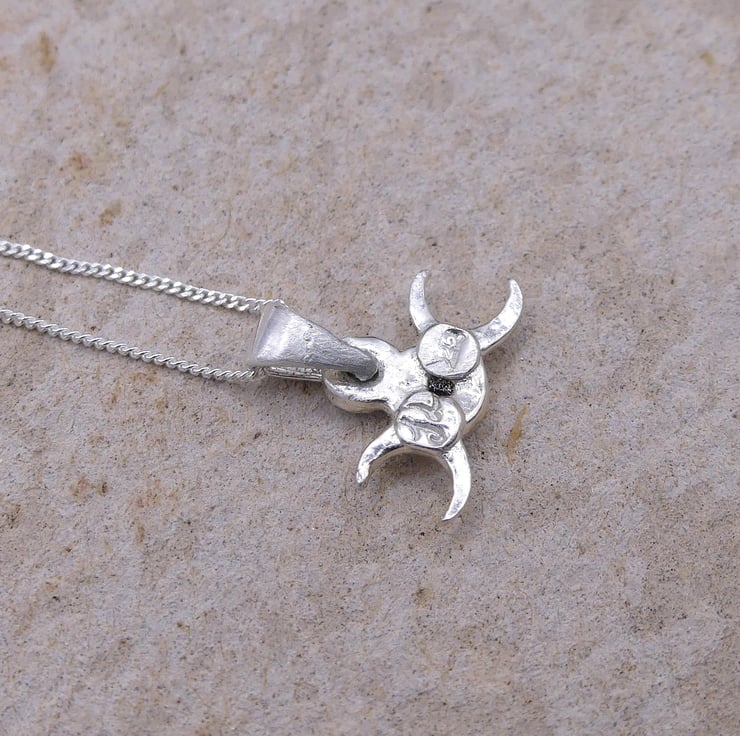 The triple moon is a goddess symbol that represents the Maiden, Mother and Crone as the waxing, full and waning moons. Together they also symbolize the cycle of birth, life, death, and rebirth. It is a symbol of the spiritual aspects of femininity, such as intuition, psychic abilities, creativity and wisdom.