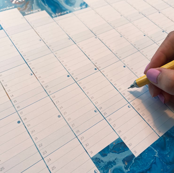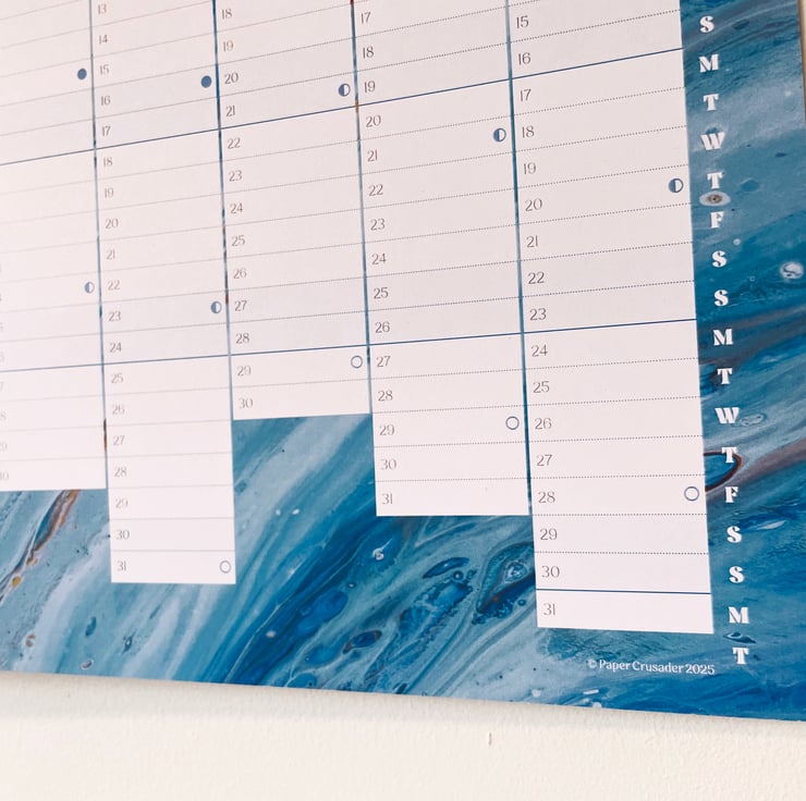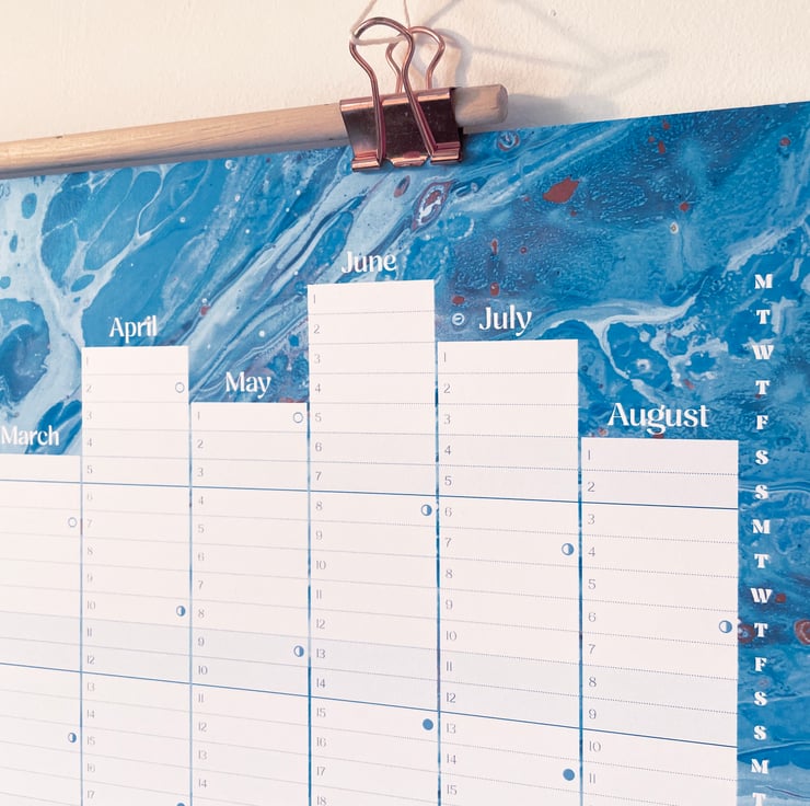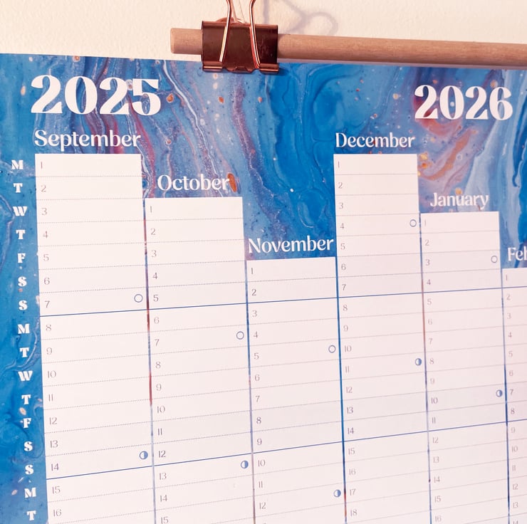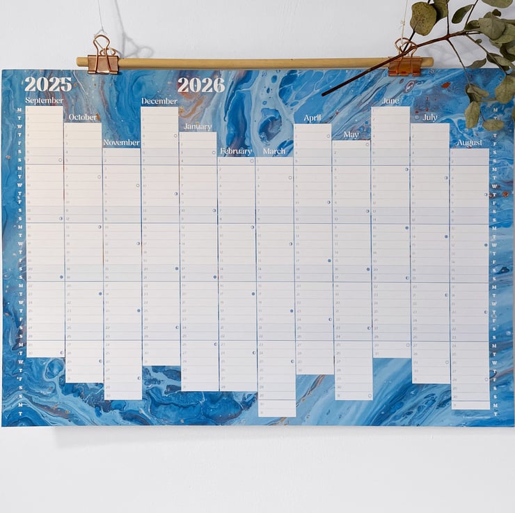 Sep 2025 – Aug 2026 academic year printed wall planner with a beautiful blue liquid marble background. Have a look at my other listings to see which design is your favourite.