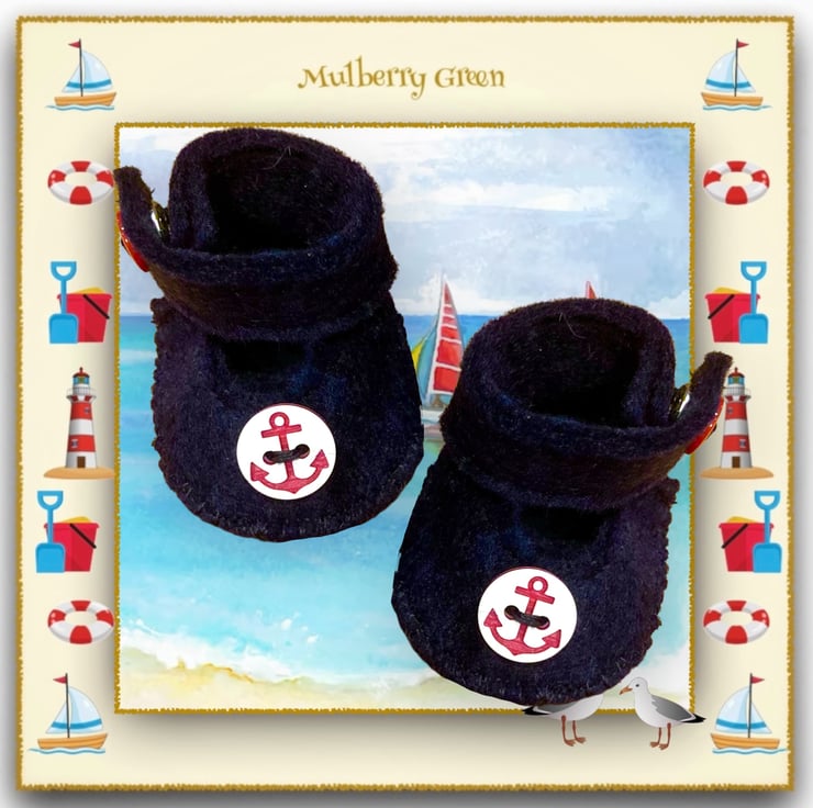 A cute little pair of navy blue shoes, decorated with little anchors, to fit the Mulberry Green dolls. The shoes fastened with a little popper under the button.