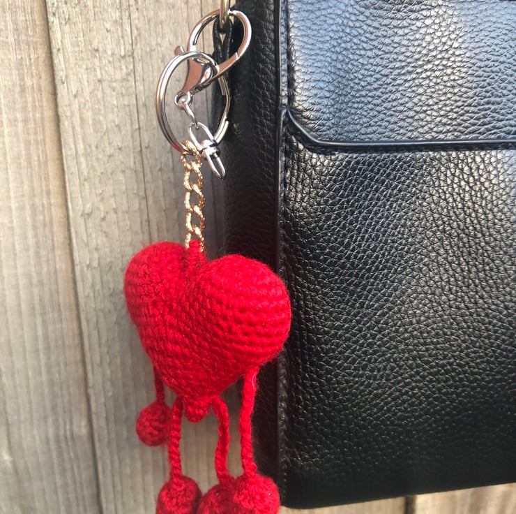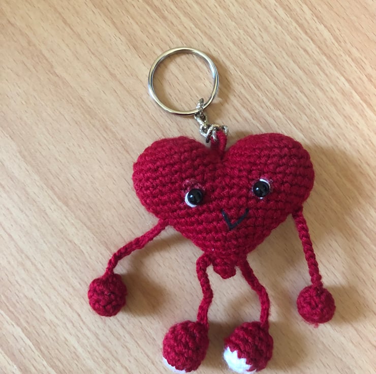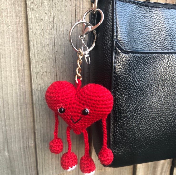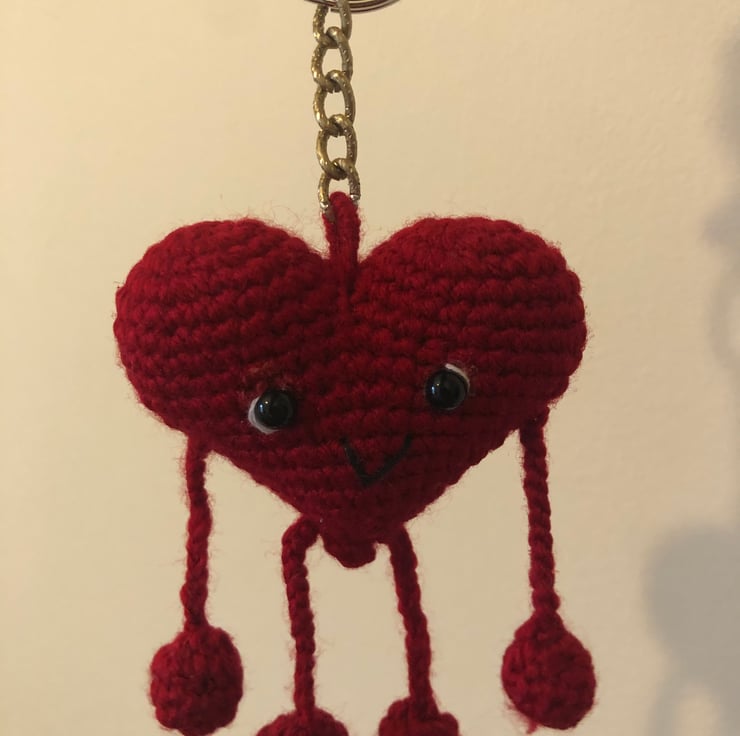 This heart-shaped keychain with legs was carefully hand-crocheted, with attention to every detail.