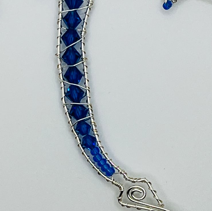 This unique piece is made using silver plate wire wrap and a mix of Preciosa seeds beads, fire polished glass beads and crystals.