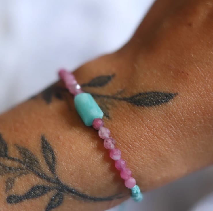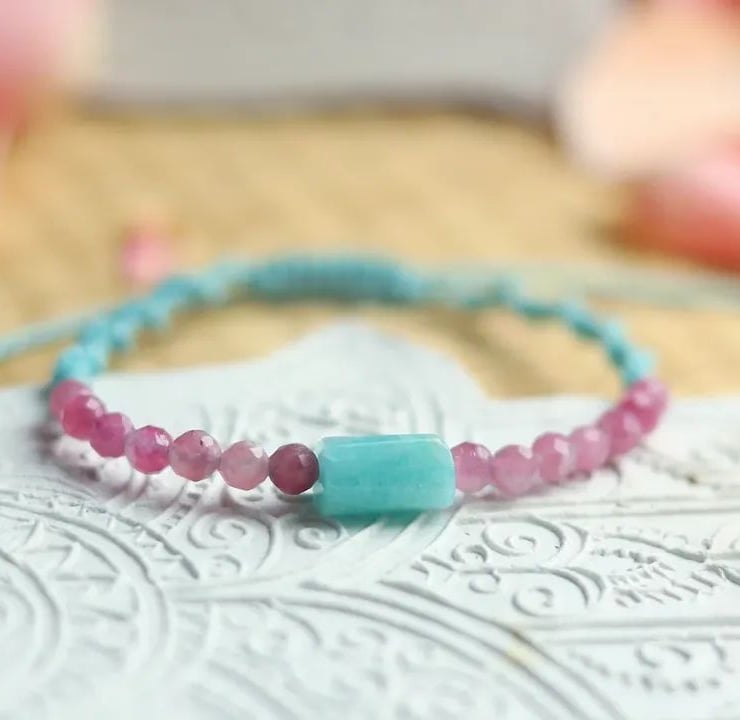 Macrame adjustable bracelet with amazonite and pink Tourmaline in blue