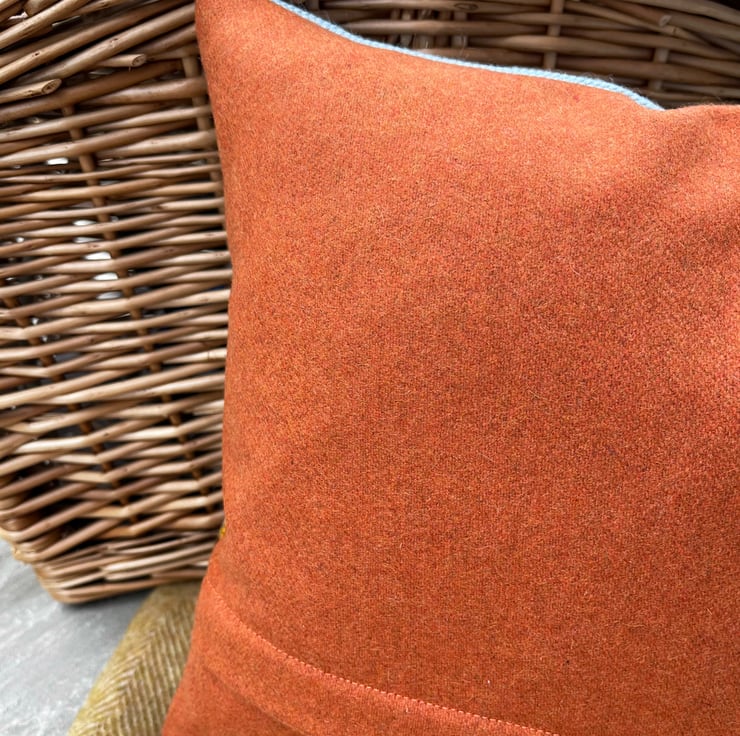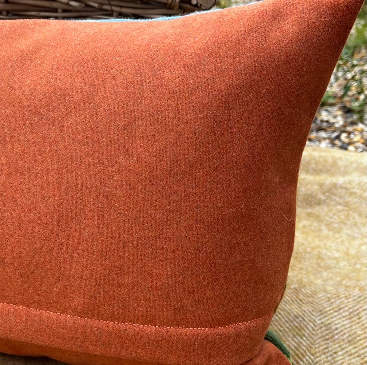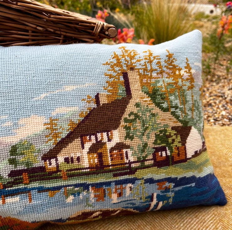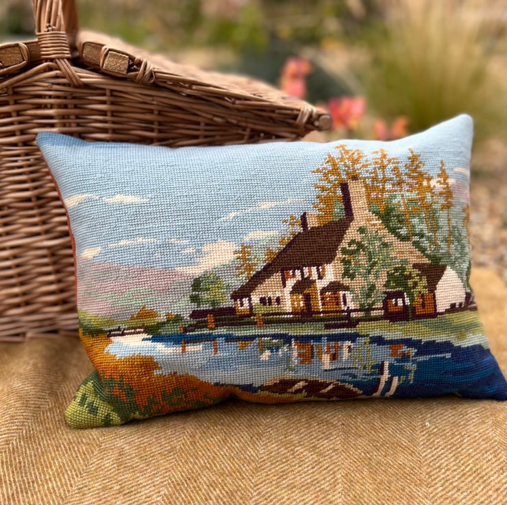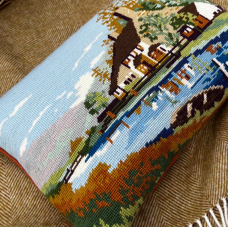 Beautiful one of a kind cushion cover made from a rescued tapestry with a riverside cottage scene. I have backed it with soft rusty orange upholstery wool.