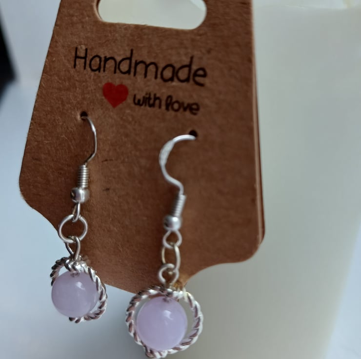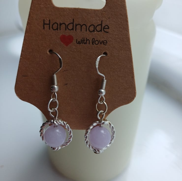 lovely silver hooks leading to a lilac bead incased in a silver coloured hoop.