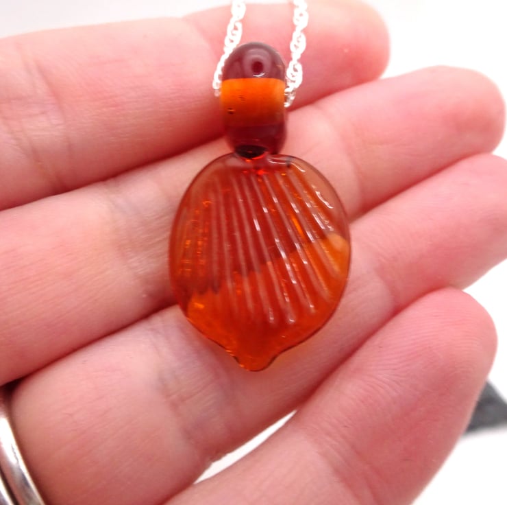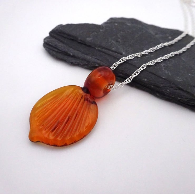 A sterling silver chain strung with a handmade lampwork glass leaf pendant.