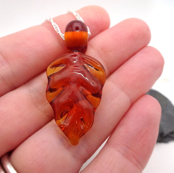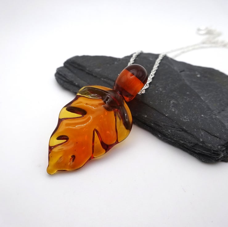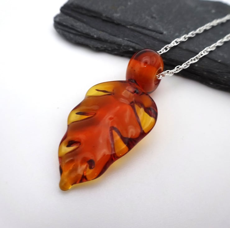 A sterling silver chain strung with a handmade lampwork glass leaf pendant.