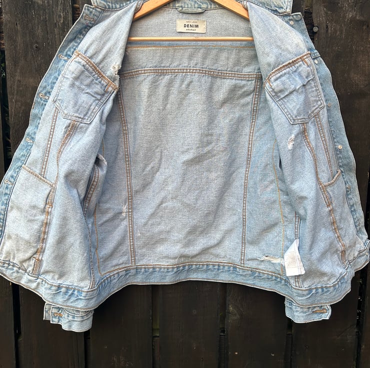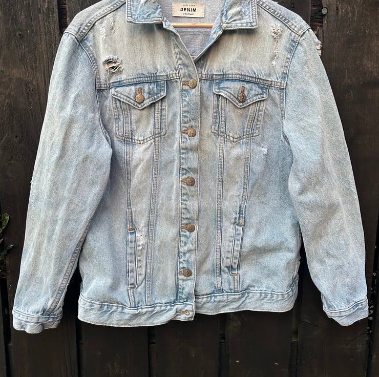Upcycled from a preloved New Look jacket which is light blue in colour and has a purposely distressed/torn style.