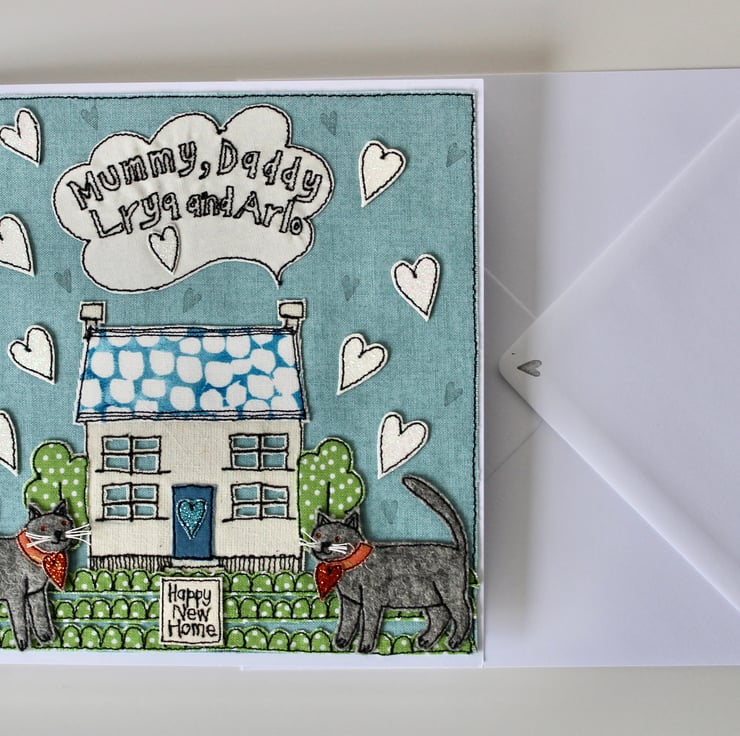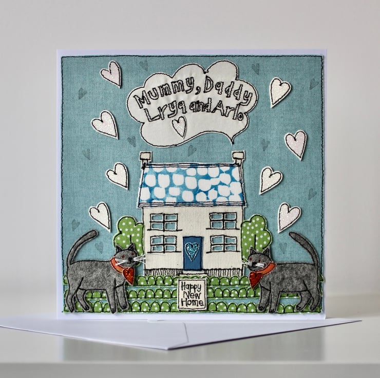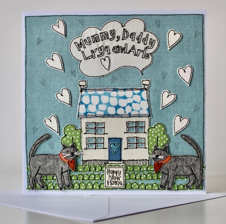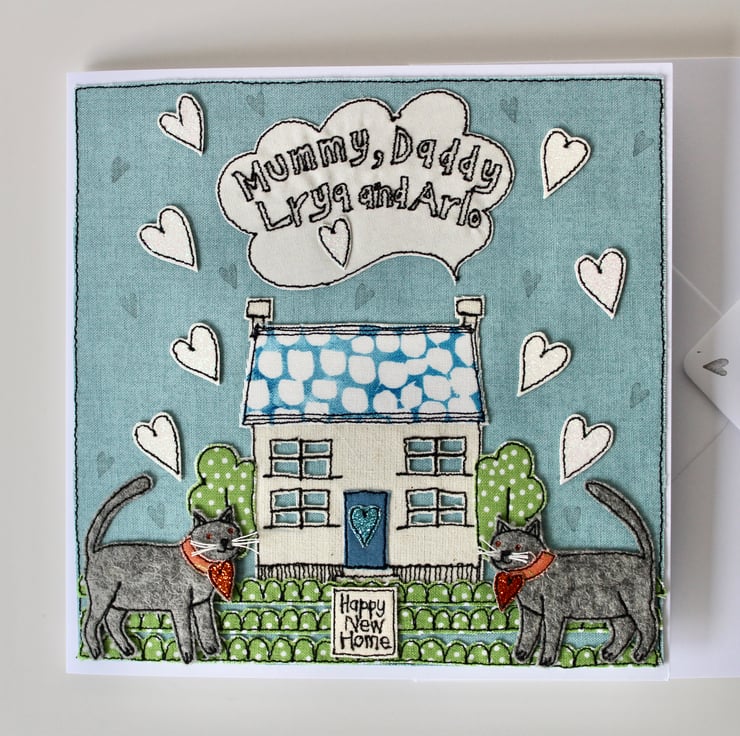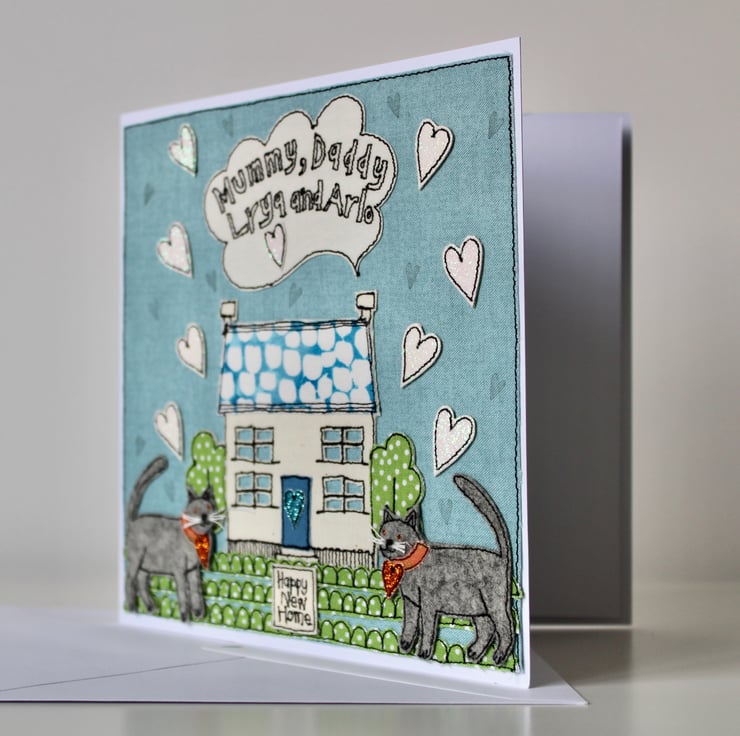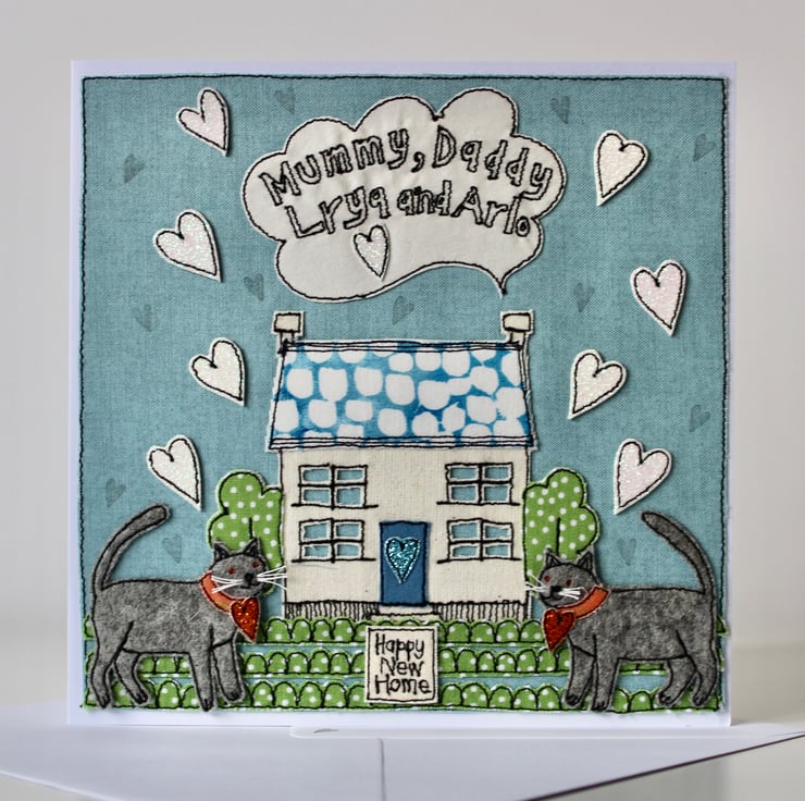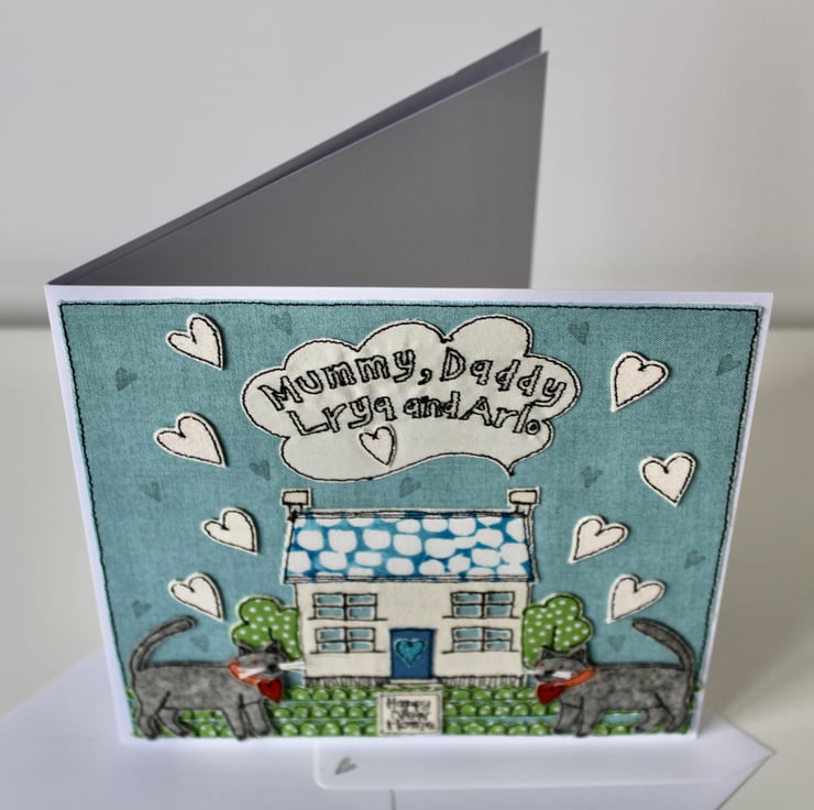 A handmade card which includes a house, two cats, hearts and sewn names 'Mummy, Daddy, Lrya and Arlo'.