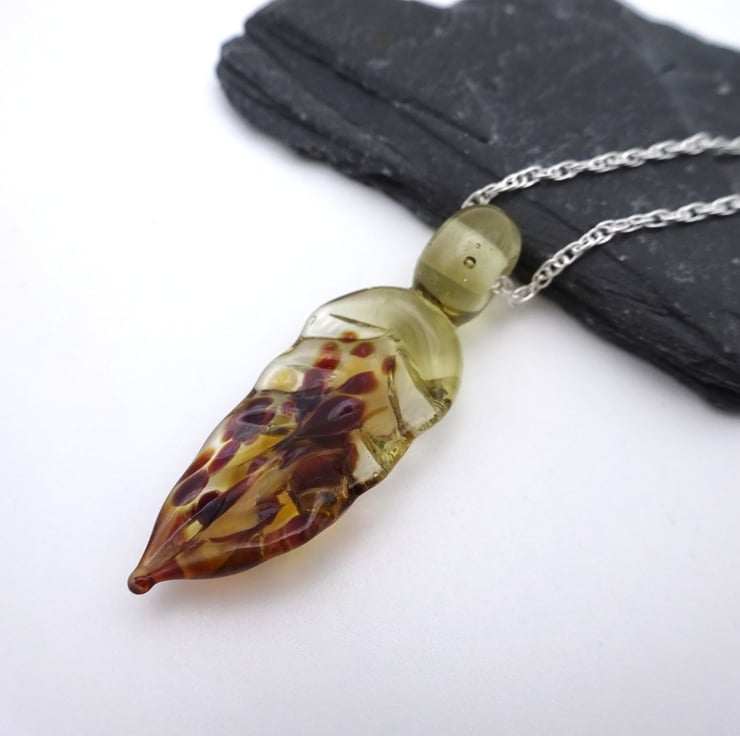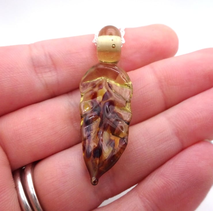 A sterling silver chain strung with a handmade lampwork glass leaf pendant.