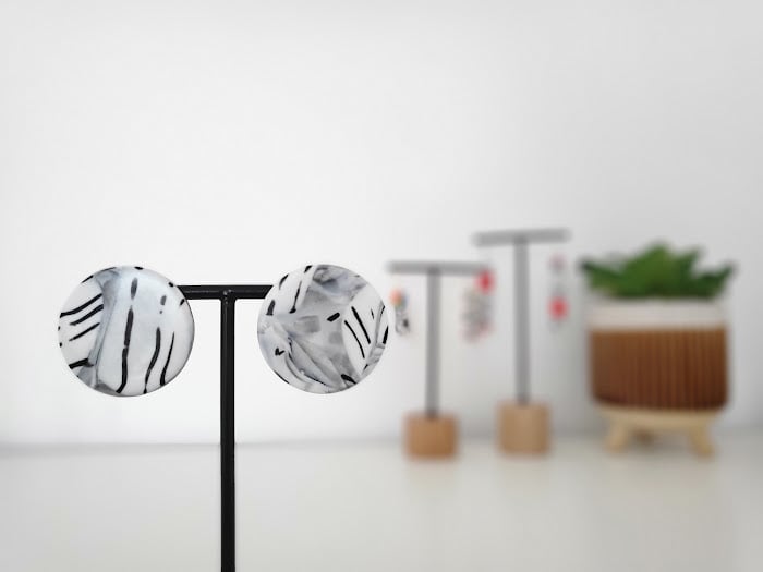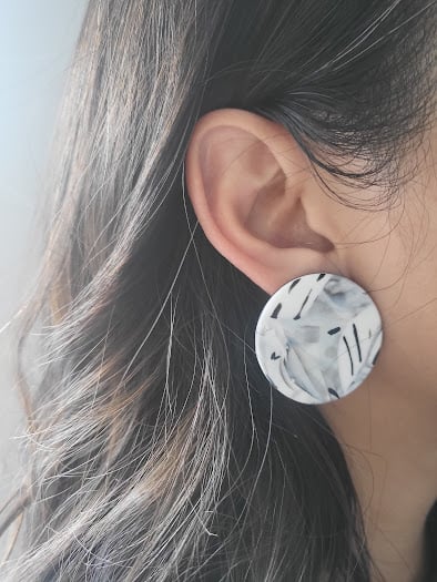 Add a touch of modern artistry to your collection with these one-of-a-kind polymer clay stud earrings. Each earring is meticulously handcrafted, blending shades of white and gray polymer clay to create a beautiful, swirling marble effect. Bold, black lines are carefully painted on the surface, giving them a graphic, abstract feel.