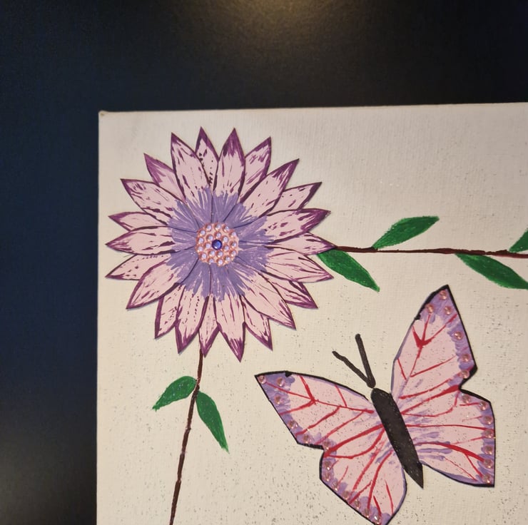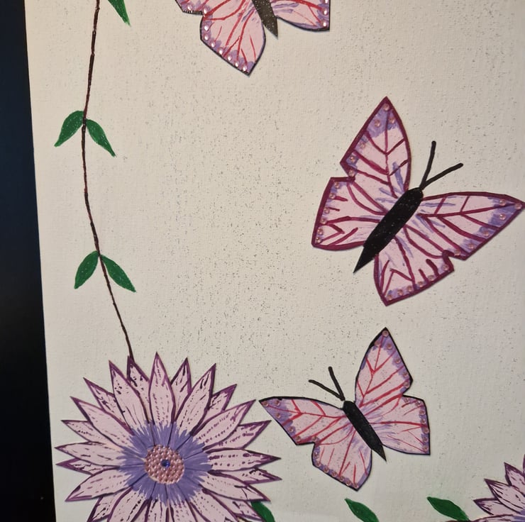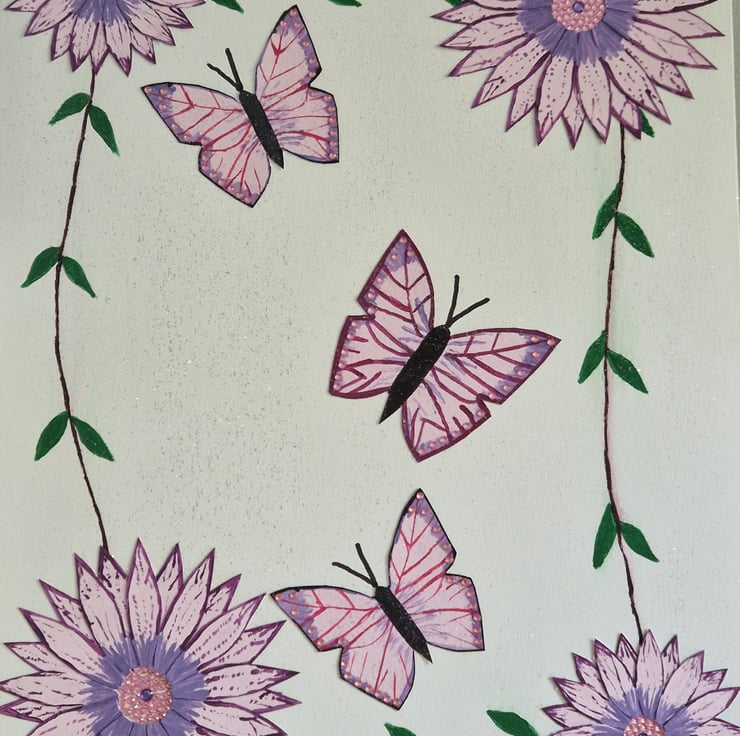 A handmade collage consisting of three butterflies, surrounded by four flowers. On canvas, measuring 16x12 inches approx.