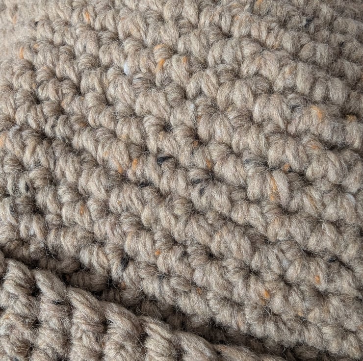 This is a snug fit beanie, a pattern that I designed and made with 100% recycled fibres. The hat is available in 3 colourways: marled, brown and beige. This hat is ultra cosy as it was crocheted up with 2 strands of wool held together. The yarn itself also has a tweed pattern with specks of oranges, browns and whites dotted around.