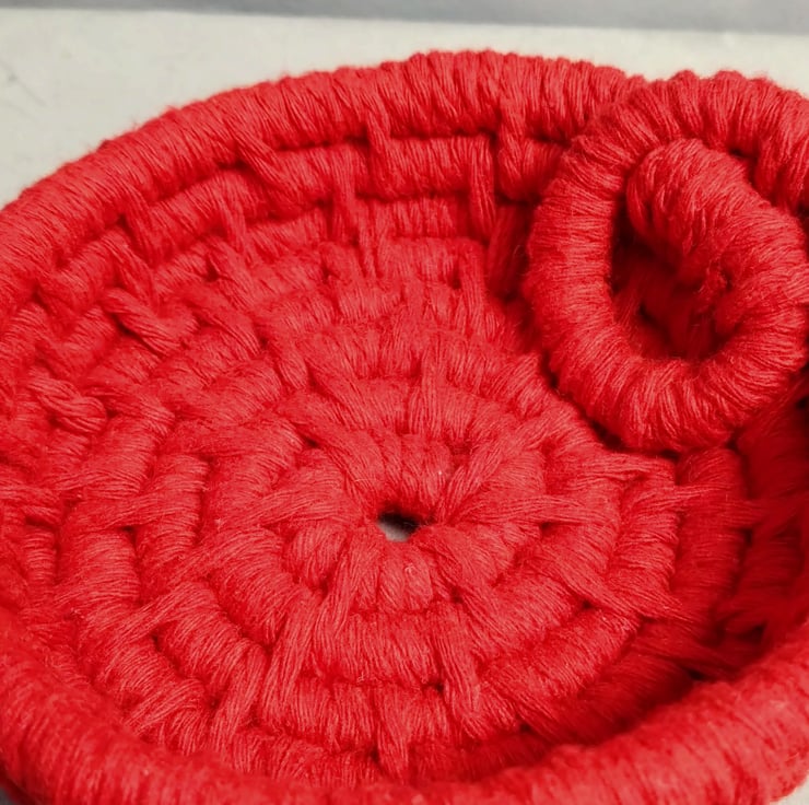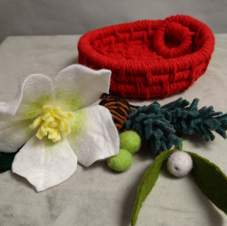 A handwoven basket made by me from red cotton macrame cord with a spiral detail. Filled with a handmade felt Hellebore flower(known as a Christmas Rose), a pine branch, a mistletoe sprig, pine cones and berries. I designed this basket to be used as faux pot pourri, as you can put essential or fragrance oil on the berries to scent your room. The basket is approximately 11cm across. Made to order and sent with FREE UK postage in 1 to 2 weeks.