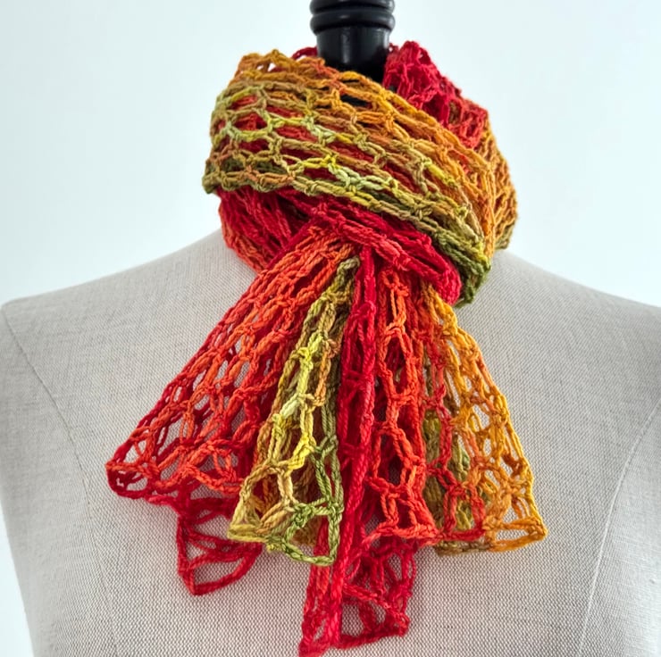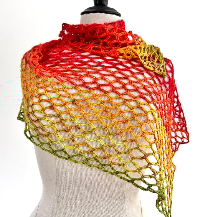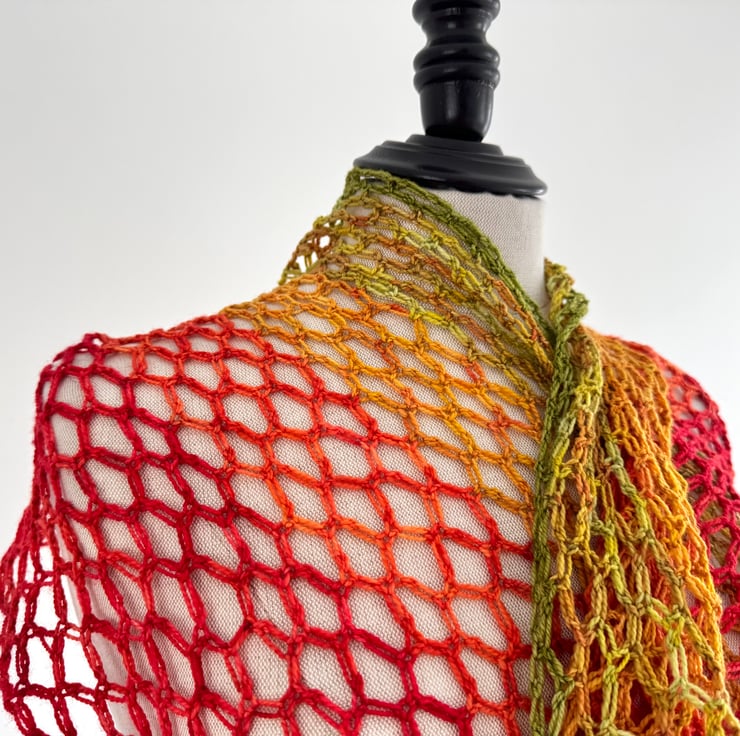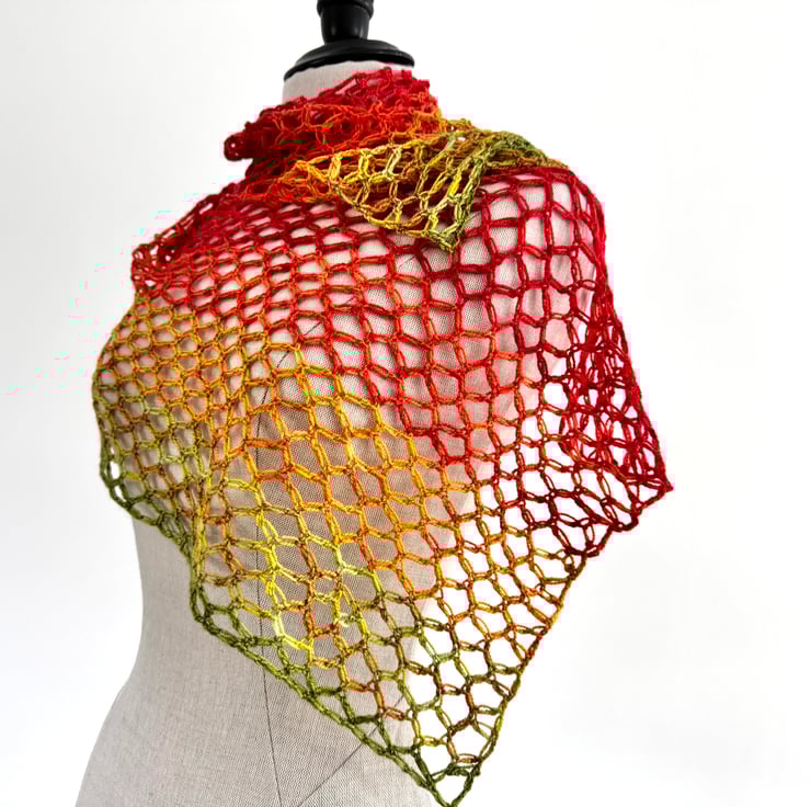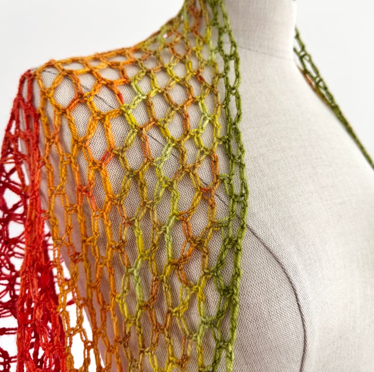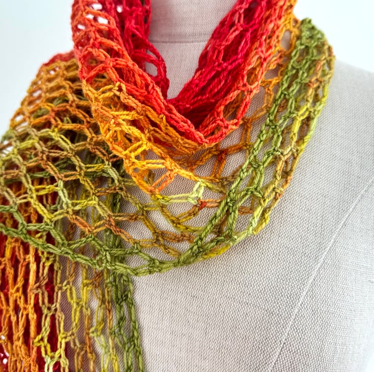 This is a bright and vibrant summer shawl made with a light weight merino wool. Colours range from zingy green to radiant scarlet, Rocket lolly style! Incredibly soft and light