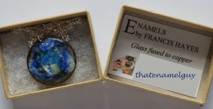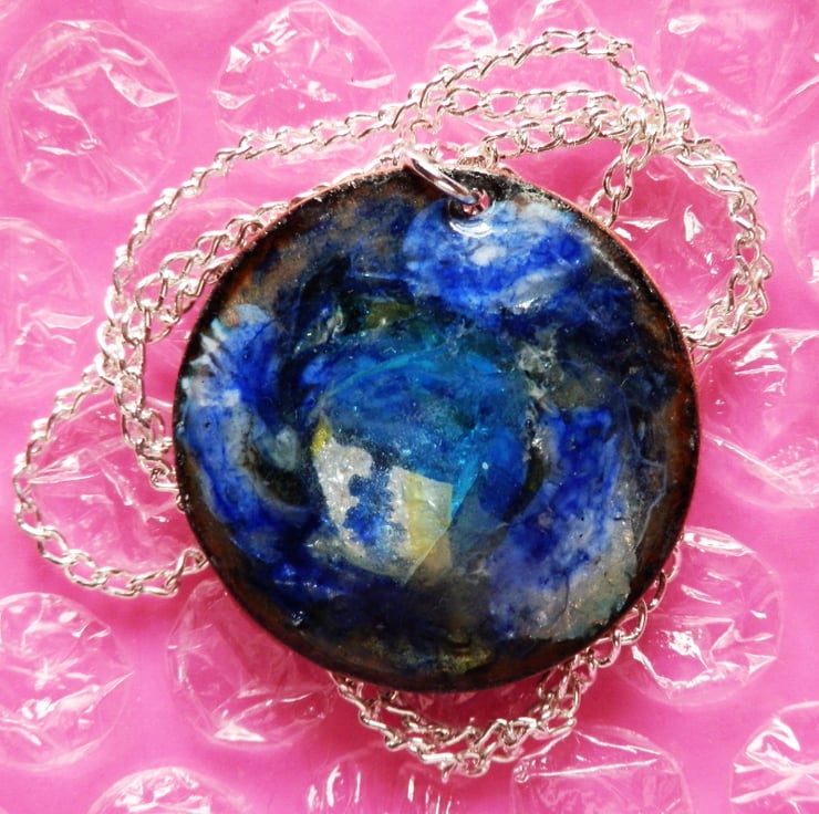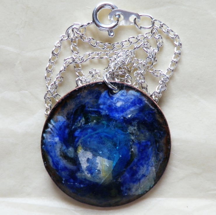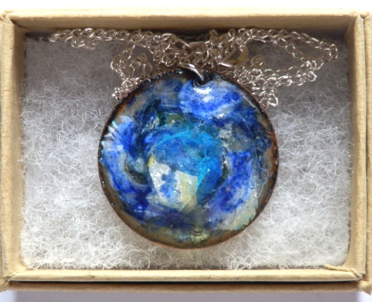 The pendant features lunps of black, blue and clear enamel fused to each other and to the copper base.