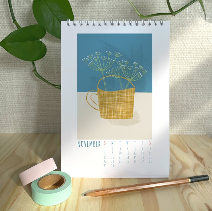 A unique desk calendar for 2026 featuring 12 Flowers in Mugs illustrations.
