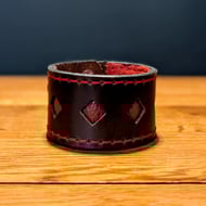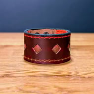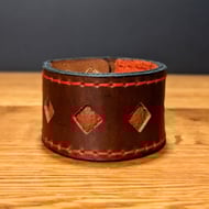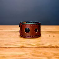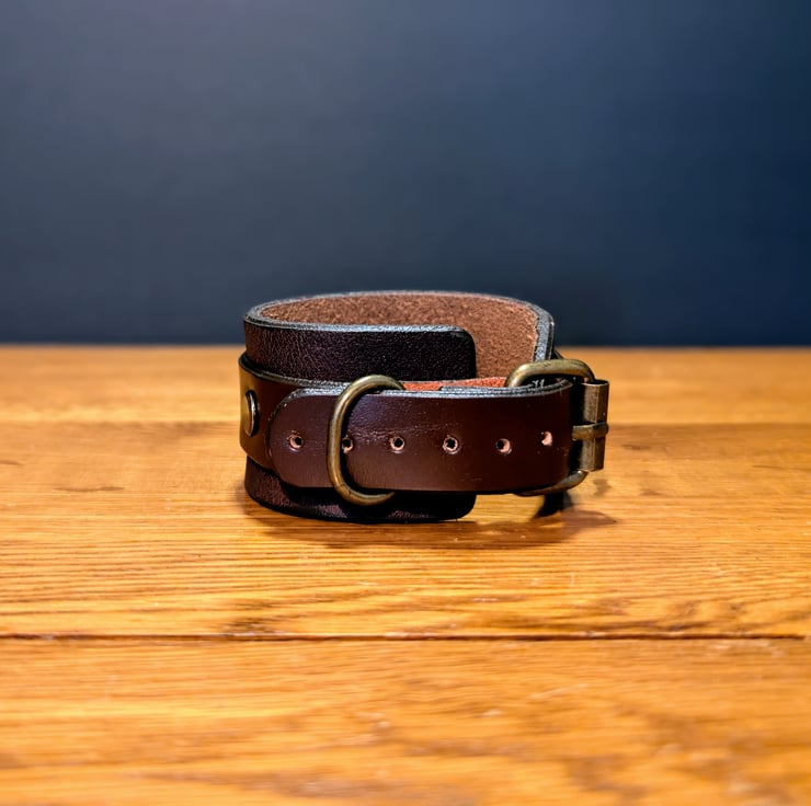 This cuff features a layer of high quality brown leather with a brown leather over-strap. Secured with bronze Chicago crews and featuring a bronze buckle and strap keeper. This durable cuff has an adjustable strap for comfort and is suitable for wrist sizes up to 25cm.
