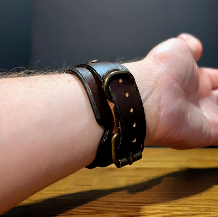 I wanted a really high quality durable cuff with a rugged masculine feel. It needed to be a good wide size and I also wanted it to be adjustable. The bronze buckle and keeper look great and taking this aesthetic further with the addition of the bronze Chicago screws really ties the look together.