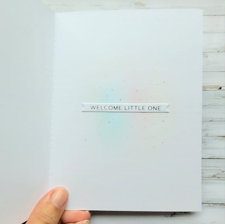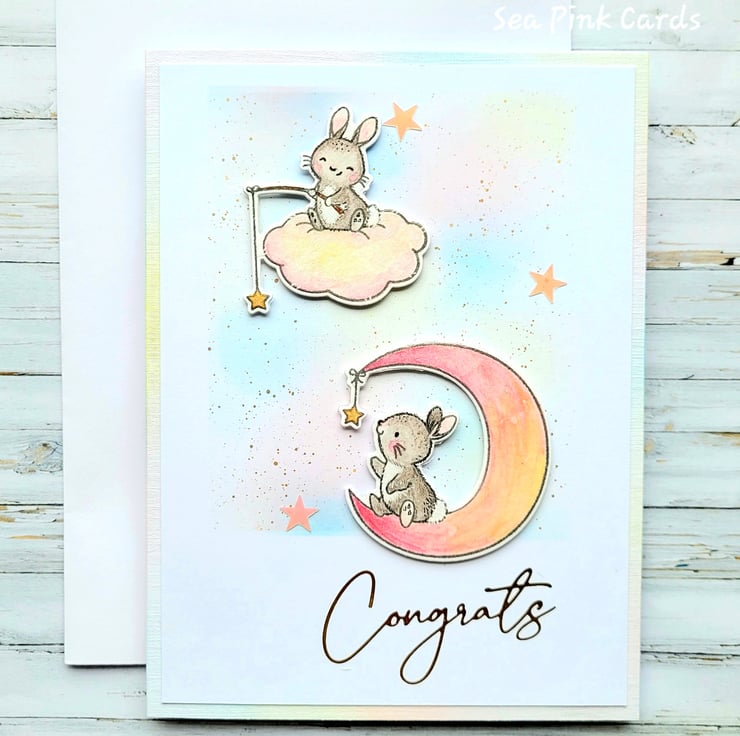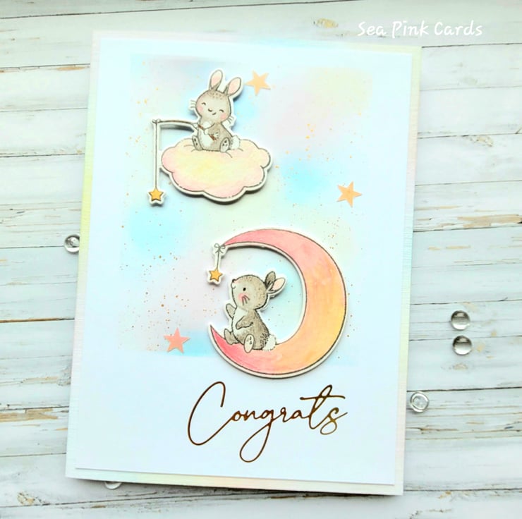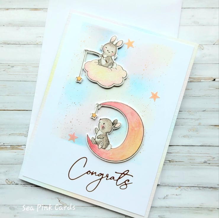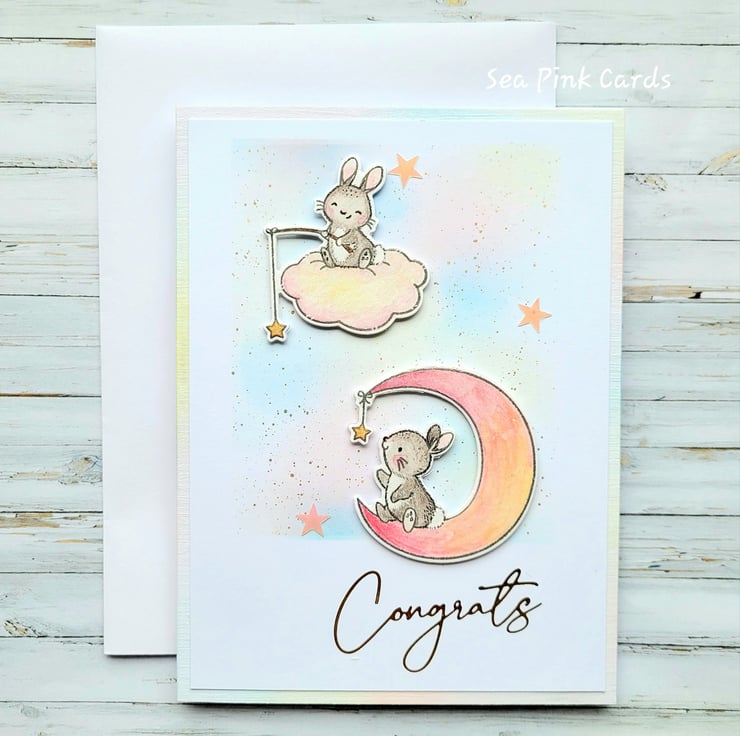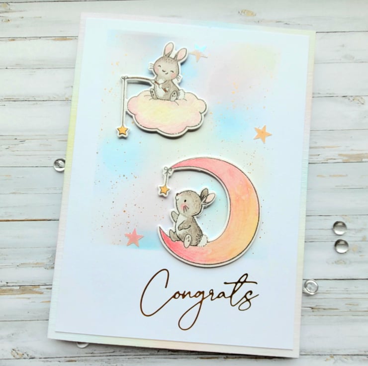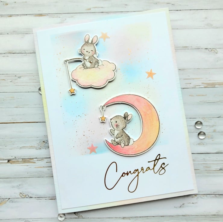 There is a gold heat foiled sentiment on the front that reads, congrats and inside has a small greeting, welcome little one! I stamped the bunnies by hand and watercoloured them with both regular and metallic watercolours. The metallic watercolours used on the moon, clouds and stars adds subtle shimmer when the card catches the light. I used archival inks and brushes to create the sky and decorated the front with 3 pearlescent stars. Tiny details are added with fineliner pens.