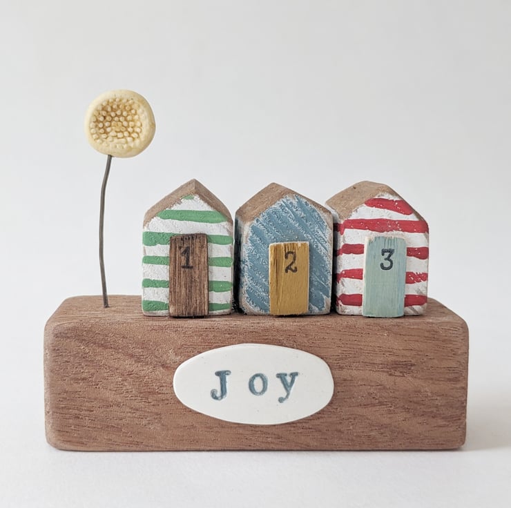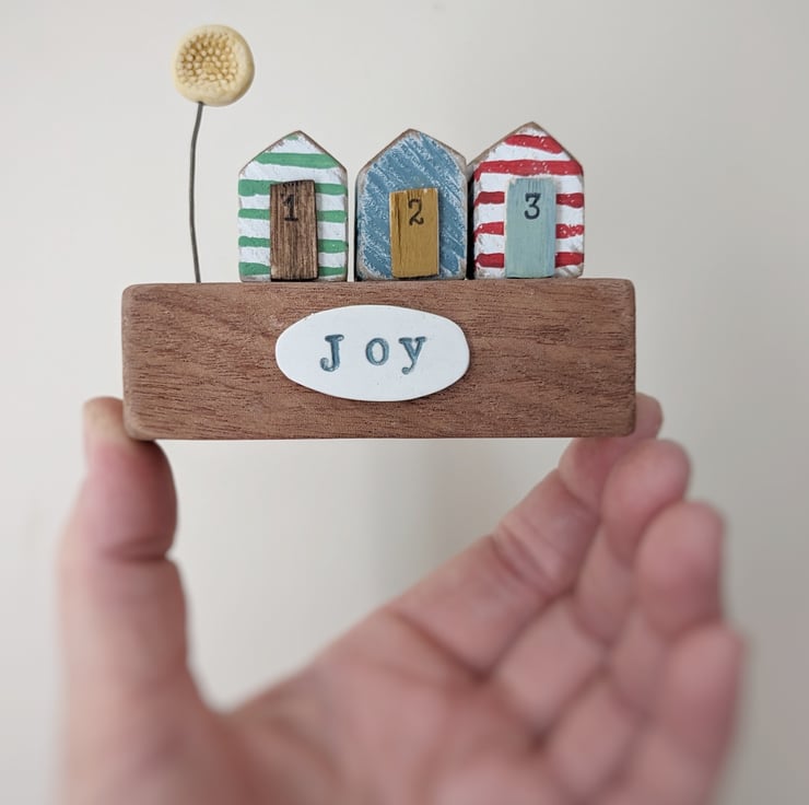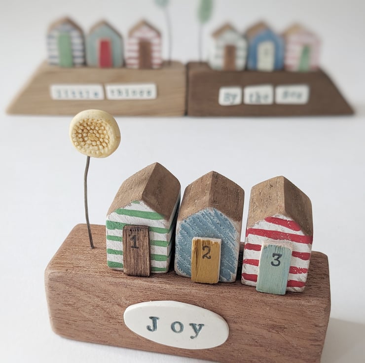 These teeny hand-painted beach huts stand in a row on a rustic wooden block.