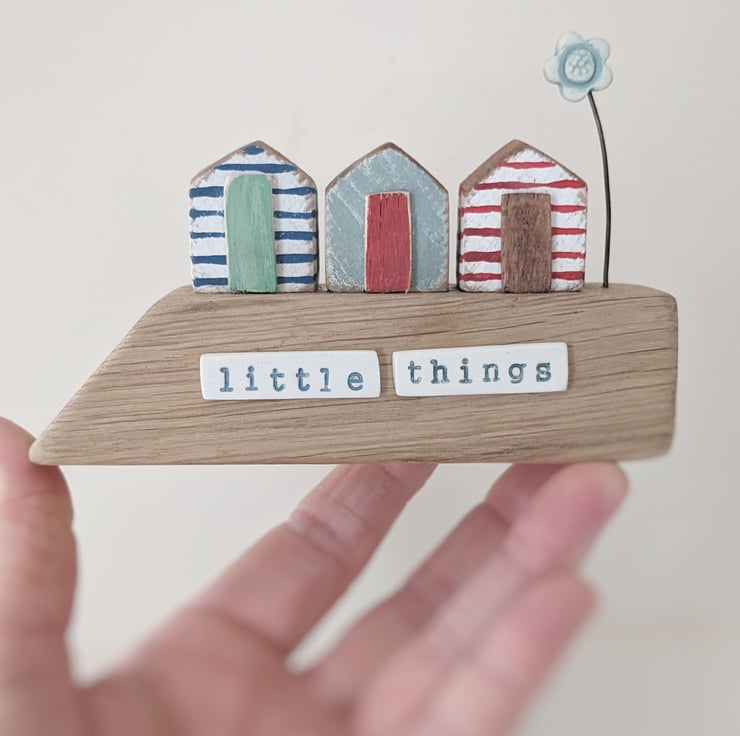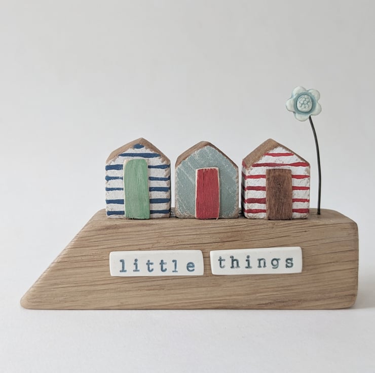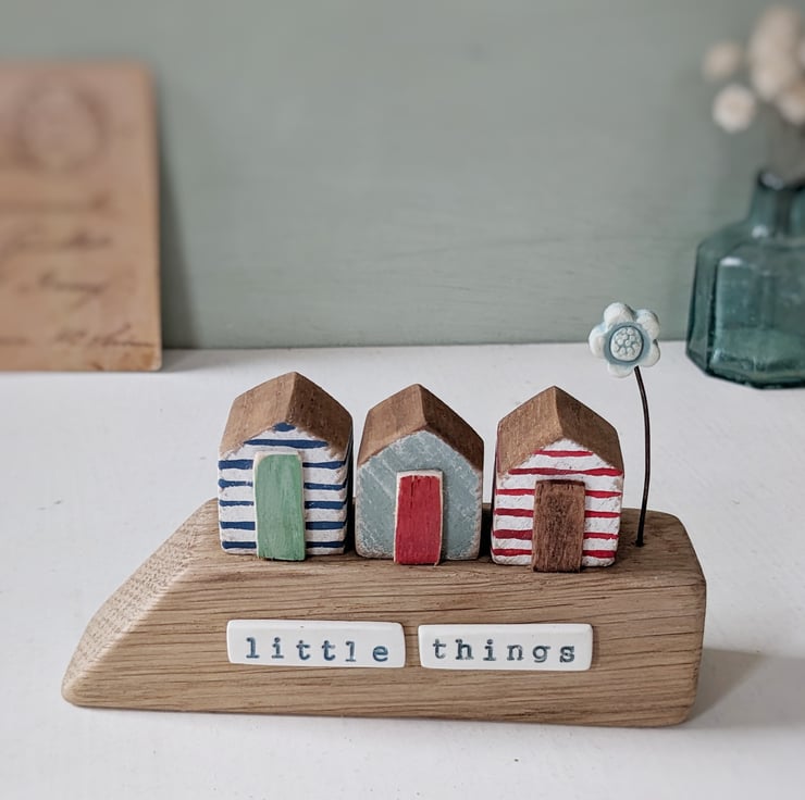 These teeny hand-painted beach huts stand in a row on a rustic wooden block.