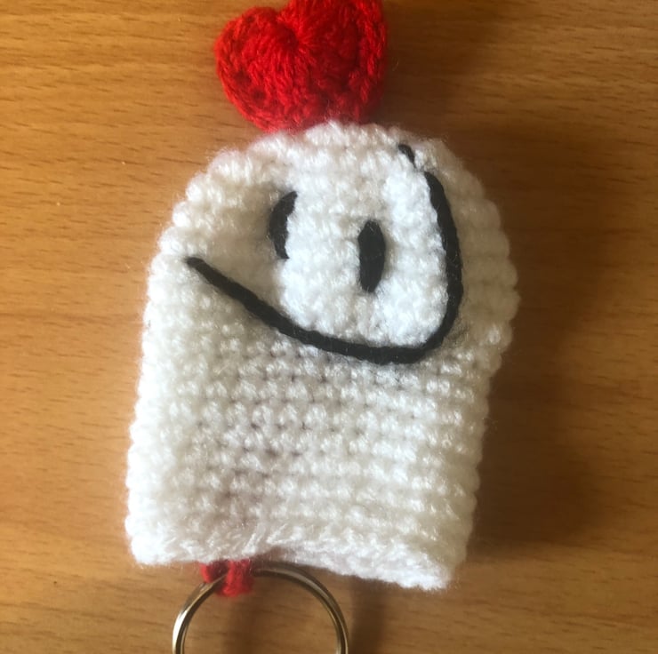 Bring the humor and cuteness of Flork wherever you go! This handmade crochet keychain recreates the iconic little white meme figure, with his friendly expression and a red heart on top. Handmade using the amigurumi technique, it's lightweight, soft, and perfect for decorating keys, bags, or backpacks. Ideal for fans of memes, pop culture, and creative items, it also makes a fun and original gift for any occasion.