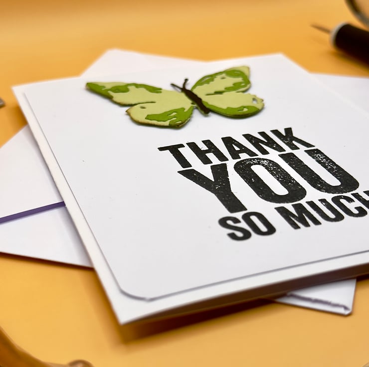 A simple, heartfelt way to say thanks. This handmade card features a layered green butterfly with lovely die-cut details, perched above the bold words “THANK YOU SO MUCH.” Clean, fresh, and nature inspired, it’s a card that works for just about any occasion when you want to show your appreciation.