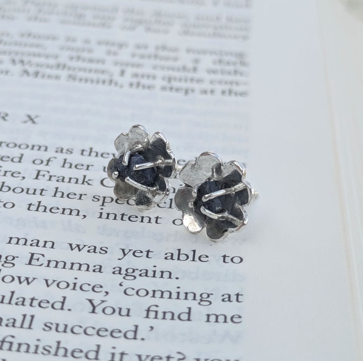 These sterling silver flower stud earrings feature a natural raw sapphire at their centre. The organic texture of the sapphire, paired with the soft curves of the silver petals, creates a piece that’s unique and would make a wonderful gift that is perfect for a birthday, anniversary, or special gift for a nature lover. Sapphire is also the birthstone for a September birthday.