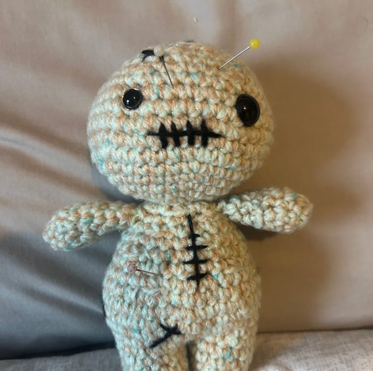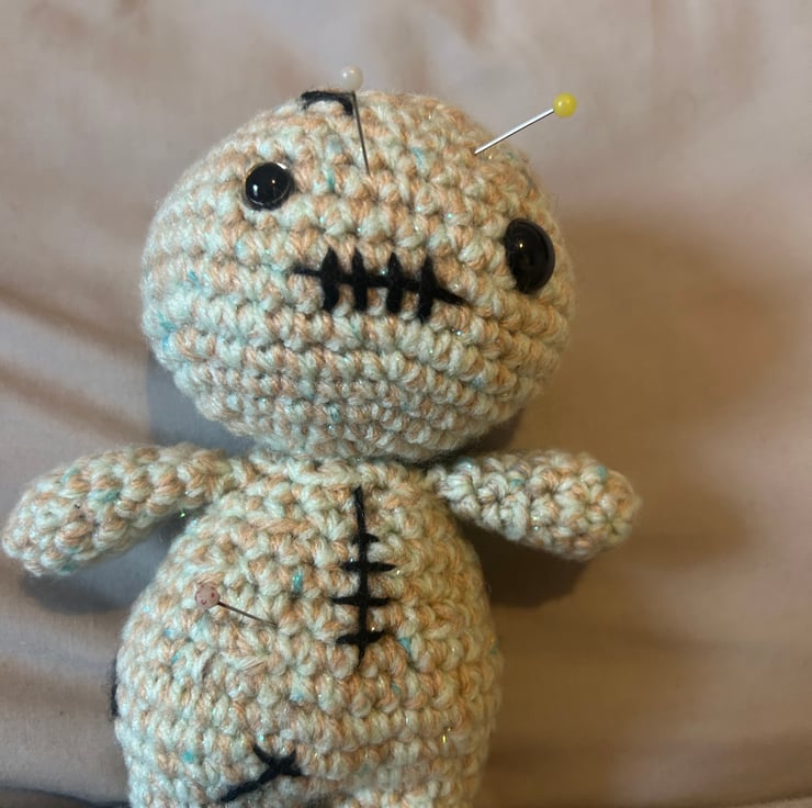 Hand crocheted amigurumi voodoo/ zombie dude. Unique, one of a kind design. Perfect for cute halloween decor or a spooky ornament. Not intended as a toy - not safe for small children - small parts. Ornamental use only.