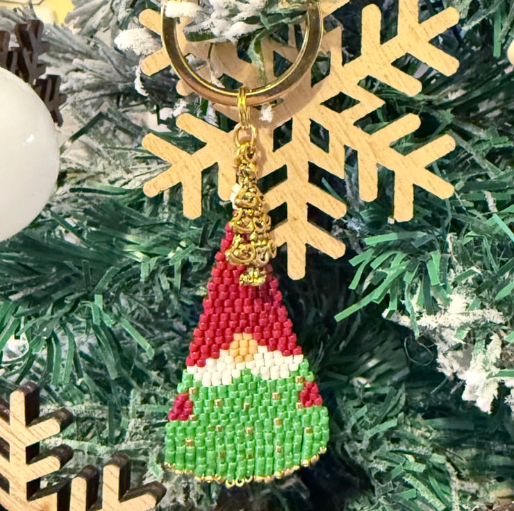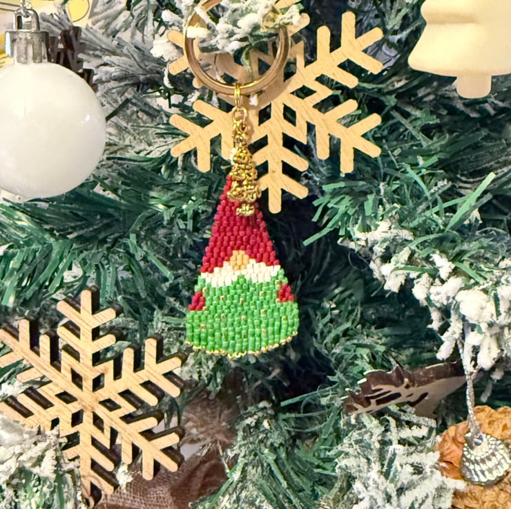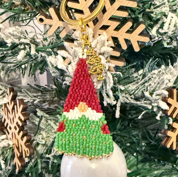 This colourful Christmas tree gnome keyring is handmade with tiny Miyuki glass beads. The beads are hand-woven in double rows to form an elongated triangle, resembling a Christmas tree/festive snow gnome. A matching beaded fringe hangs below to complete the gnome tree.