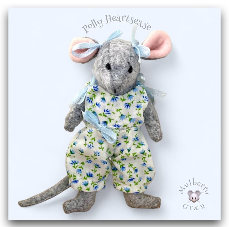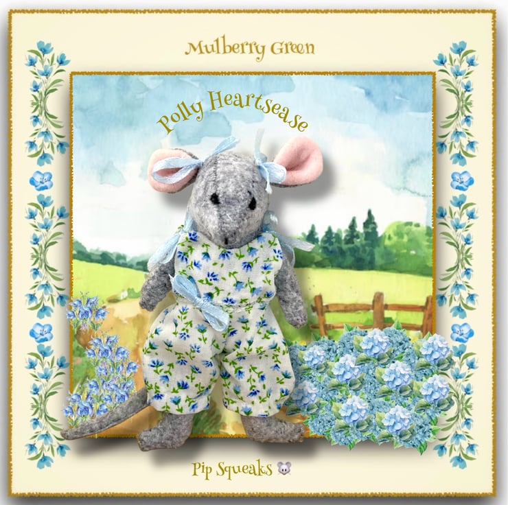 Polly Heartsease, in her pretty ditsy print dungarees, is a Pip Squeak - a young Little Nipper. Little Nippers are tiny wood mice who live in a maze of tunnels underneath the barn at Mulberry Farm. All of the Little Nippers are named after herbs and meadow flowers. Pip Squeaks are 11cm tall. Clothes made especially to fit them are also available in my shop.