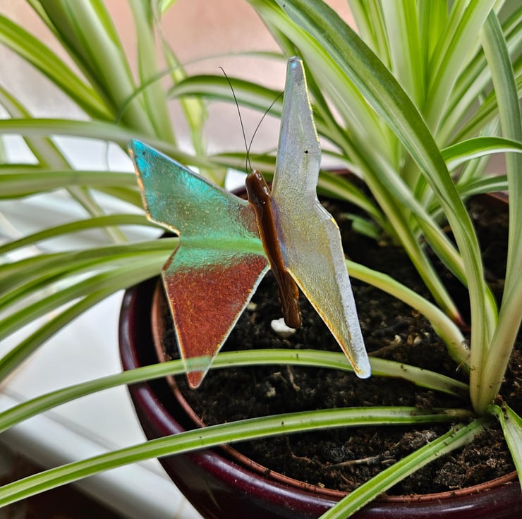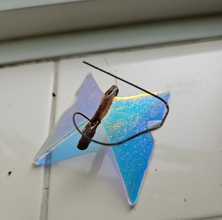 Butterflies have the most wonderful colours. Seeing this dichroic glass I just had to work out how to make it into a butterfly.