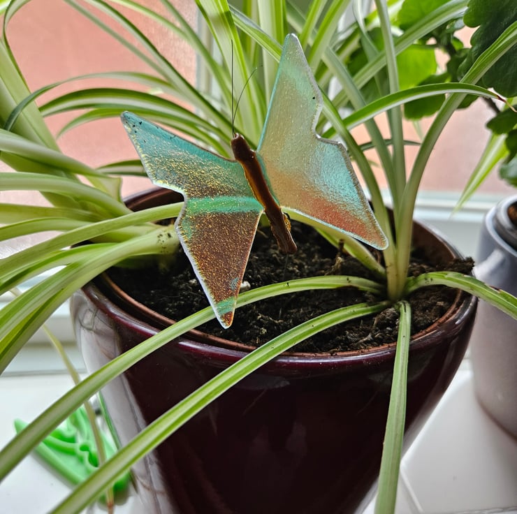 All the pictures are of the same butterfly. The glass changes colour depending on the light and the angle you view it from. It can be positioned in your flower pot by bending the wire support.