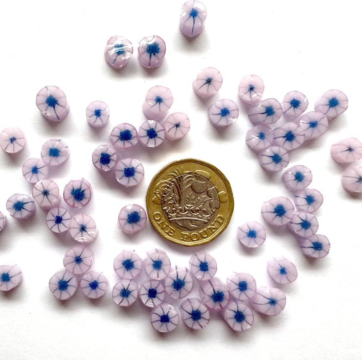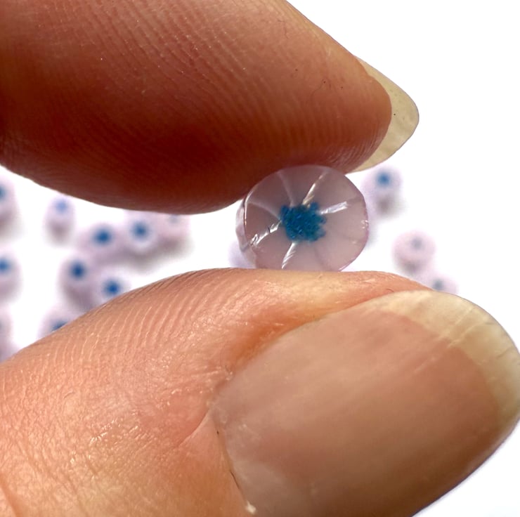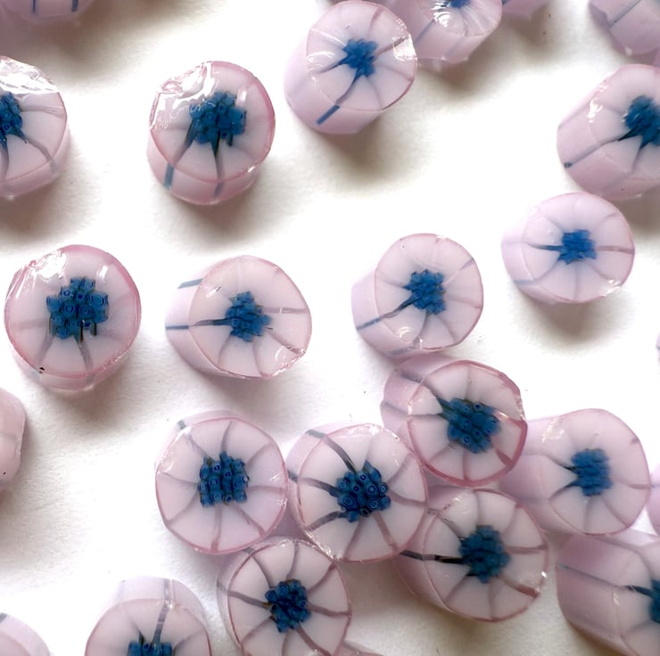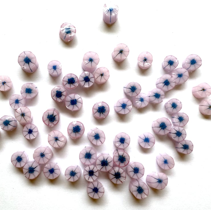 Pink with deep blue centre flower murrini handmade in the UK using 100% Bullseye glass.