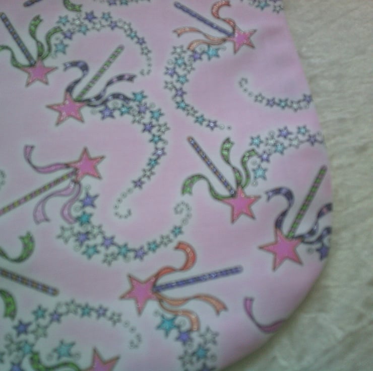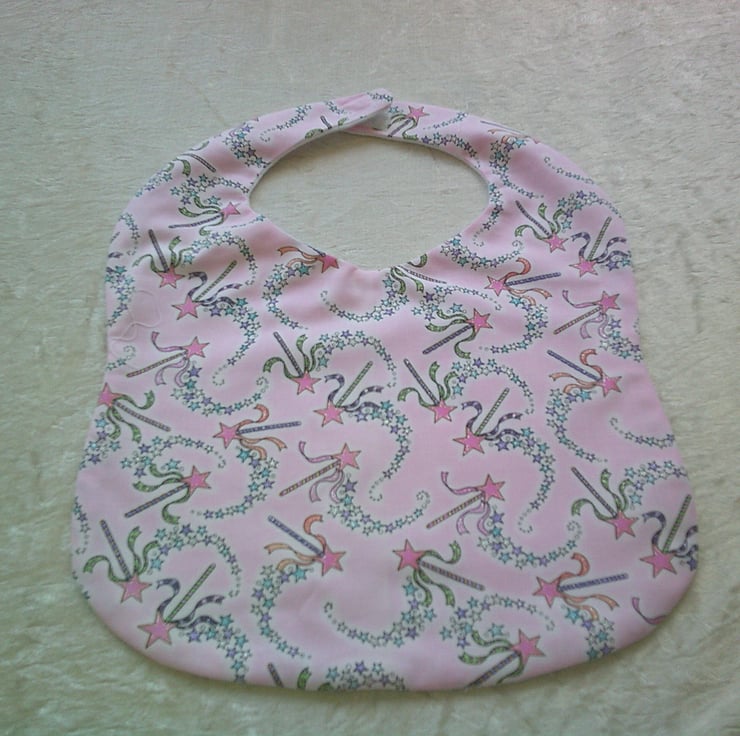 The design features Fairy Wands and Flower Garlands on a pink background. The neck fastening is Velcro so it is easy to put on and take off before and after feeding baby.
