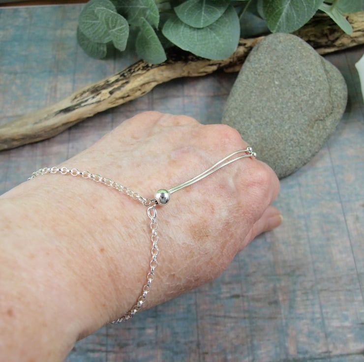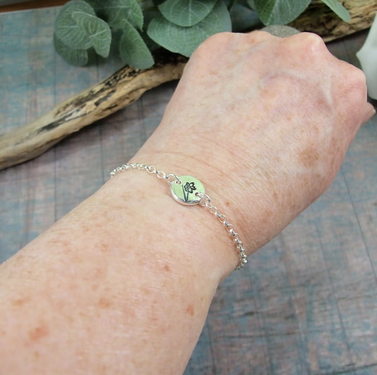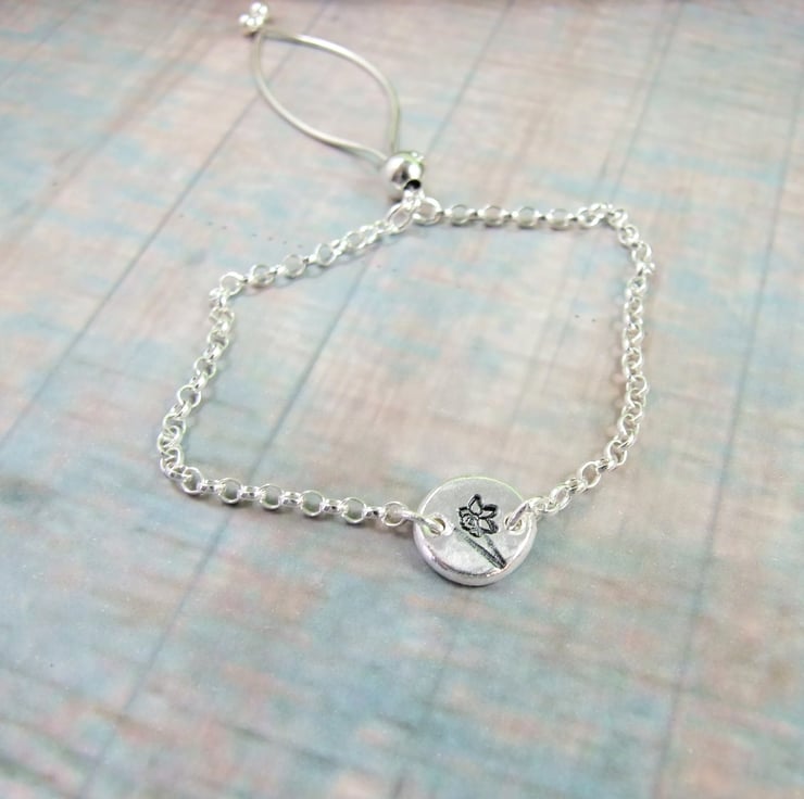 The bracelet centre piece is a little silver pebble slightly flattened and hand stamped with a daffodil flower. Securely soldered to sturdy but delicate rolo sterling silver chain with sliding silicone and silver bead clasp closure.