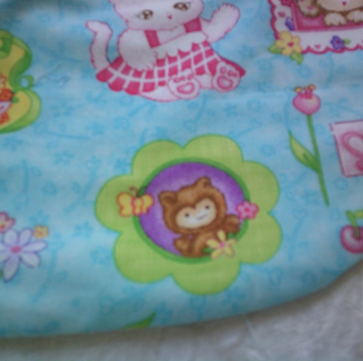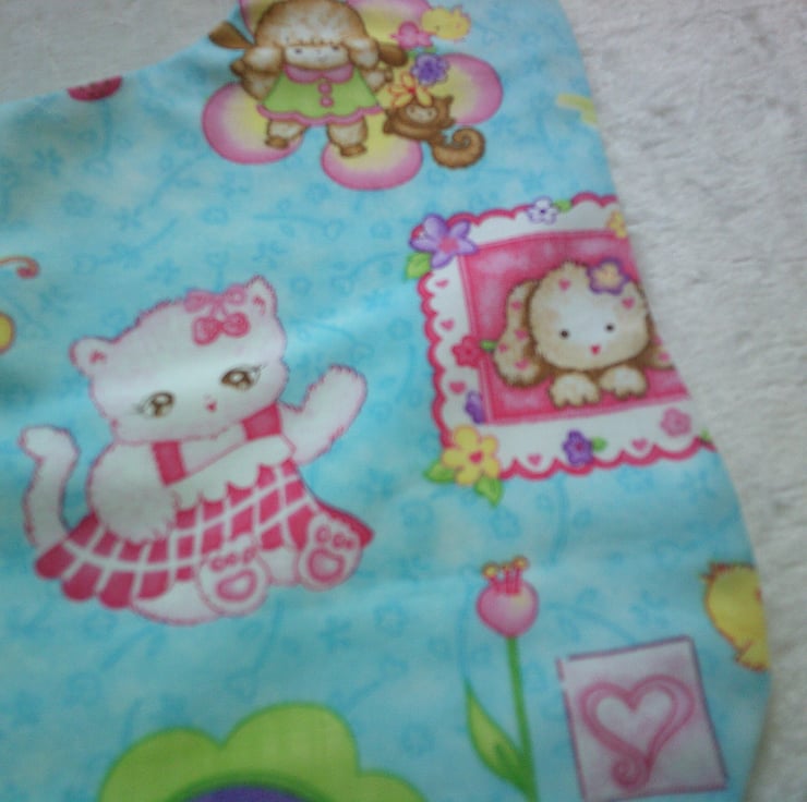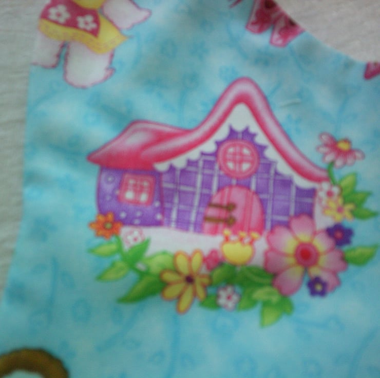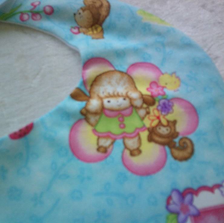 The design features cats and dogs on a turquoise background. The neck fastening is Velcro so it is easy to put on and take off before and after feeding baby.
